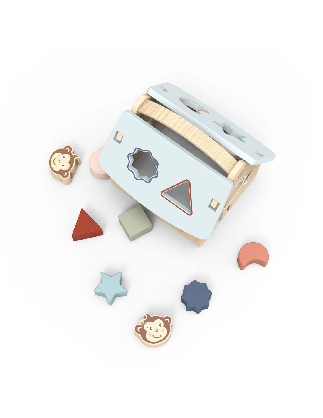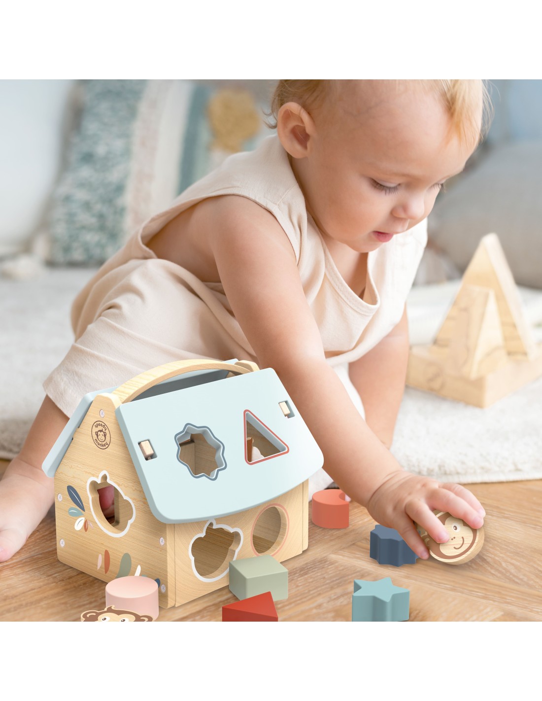 Cette adorable maison captivera votre enfant avec ses 8 différentes formes et couleurs en bois, dont le petit singe (logo de la marque).