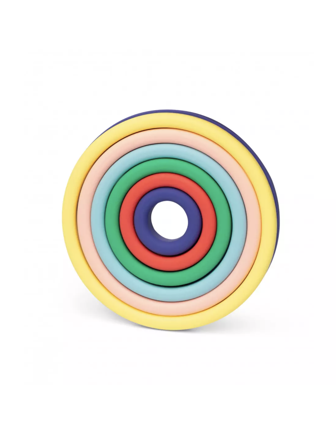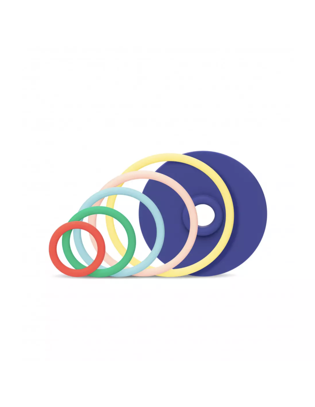Jeu composé de 5 anneaux en silicone (sans BPA ni latex) à empiler (jaune, rose, bleu clair, vert et rouge), ainsi que d'un plateau en silicone bleu foncé sur lequel on retrouve le dernier anneau bleu également.