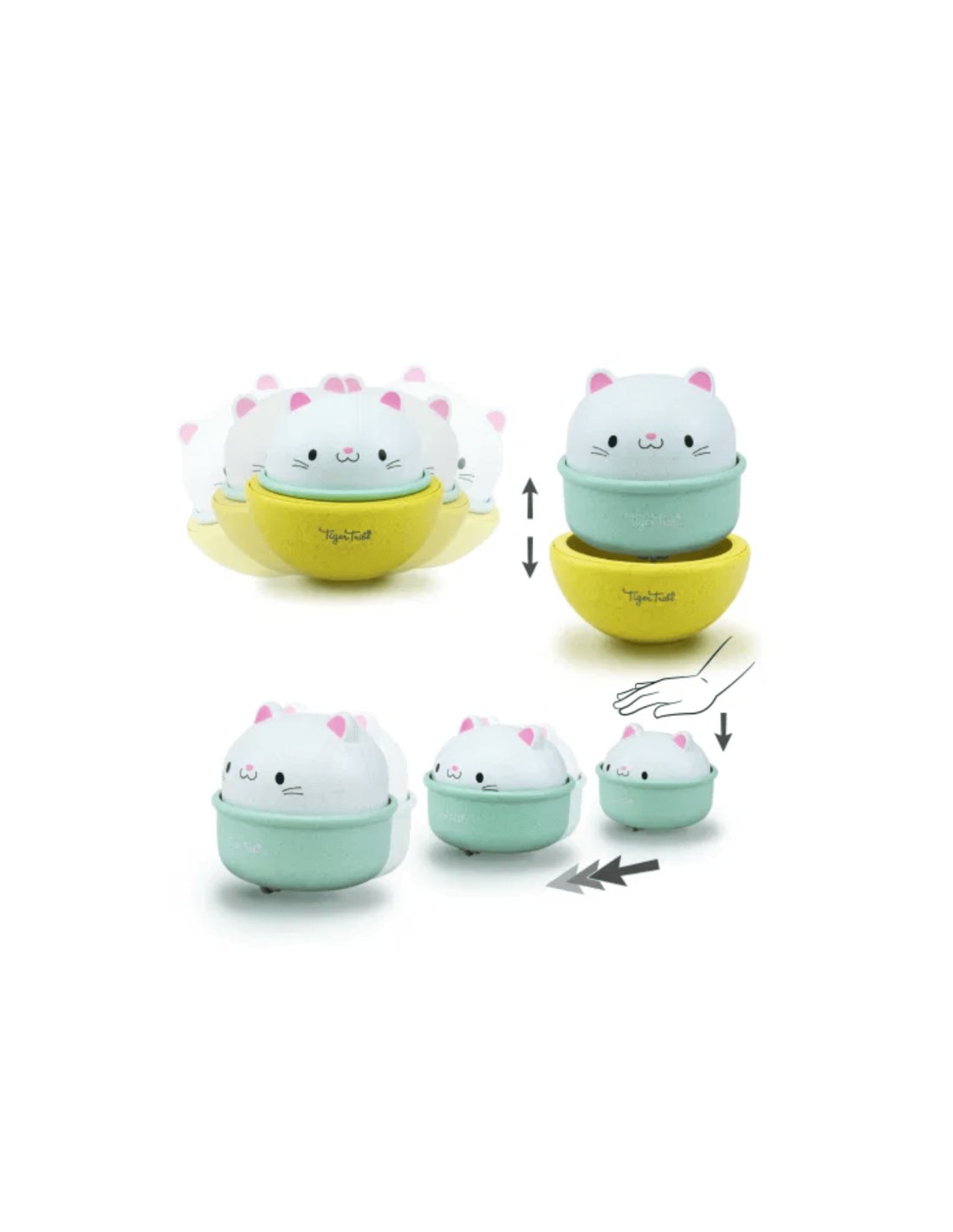 Ce petit chat 2-en-1 se balance dans tous les sens, en version culbuto, quand il a sa coque jaune.