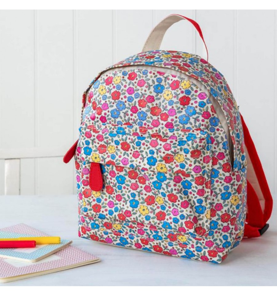 Un petit sac à dos parfait pour la maternelle et pour les loisirs, imprimé de jolies petites fleurs rouges, bleues, jaunes et roses, façon "liberty".