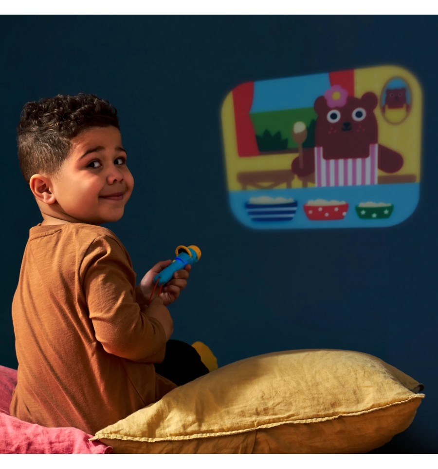 Cette lampe torche de poche projette des images tirées de vos contes préférés : Boucle d'Or, les Trois Petits Cochons et le Petit Chaperon Rouge n'attendent que toi.