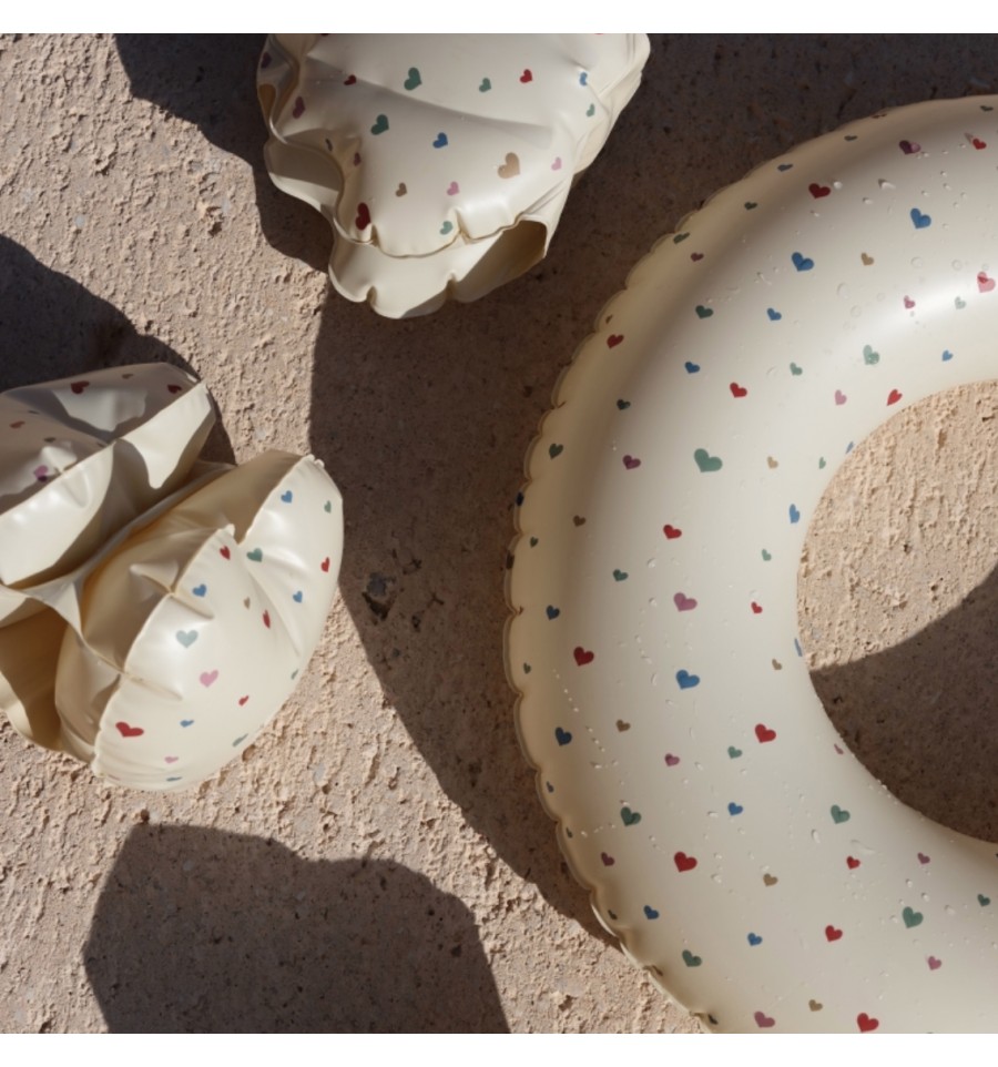 La bouée ronde coeurs Multi Hearts, imaginée par la jolie marque danoise Konges Slojd, se gonfle et se dégonfle facilement, idéale à emporter dans le sac de plage.