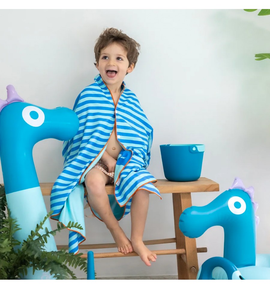 > un bouton pression permet de fixer la serviette autour de soi pour en faire une cape !