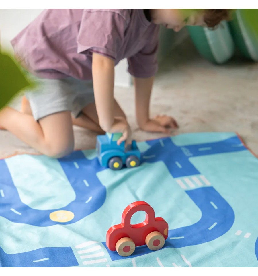 D'un côté, vous trouverez un imprimé "circuit de route", topissime pour jouer avec ses petites voitures et occuper vos petits loups pendant un moment, et de l'autre, un imprimé graphique à rayures.