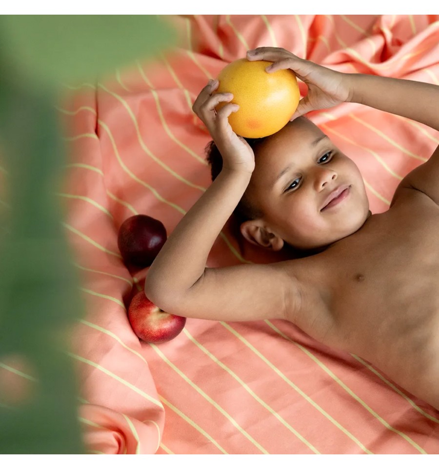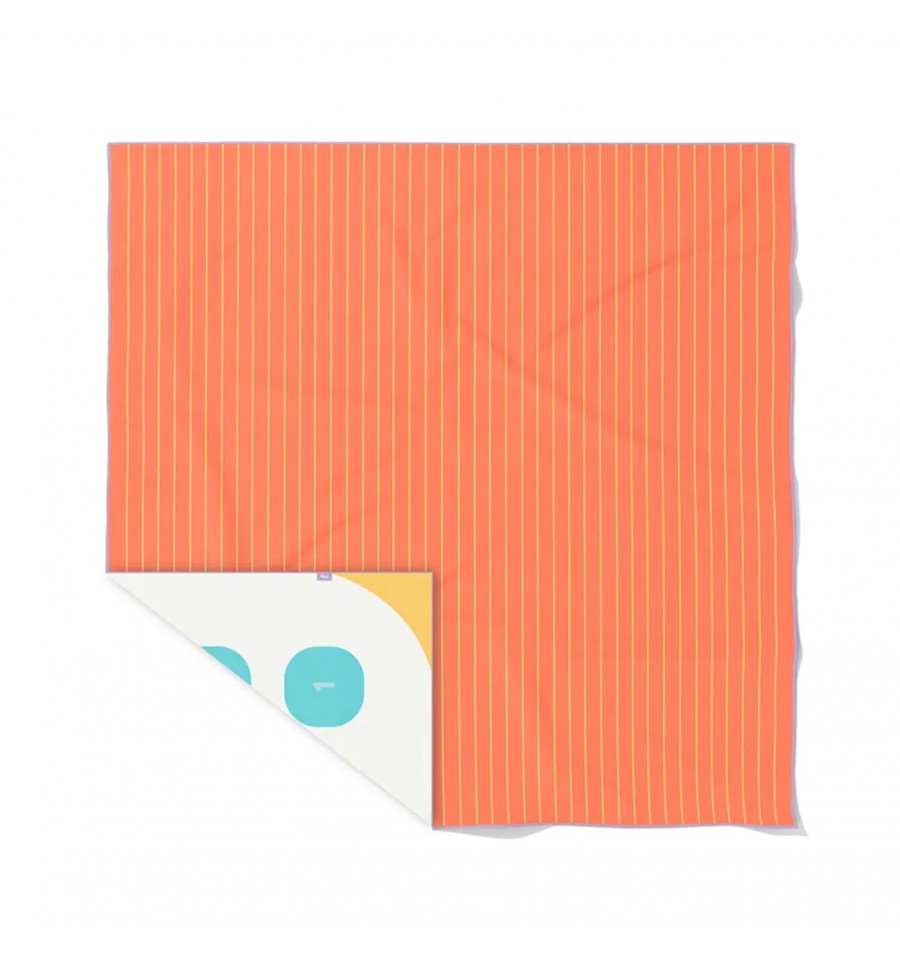 D'un côté, vous trouverez un imprimé avec des ronds hypers colorés (qui n'est pas sans rappeler un super jeux !), topissime pour jouer seul ou entre amis et occuper vos petits loups pendant un moment, et de l'autre, un imprimé graphique à rayures.