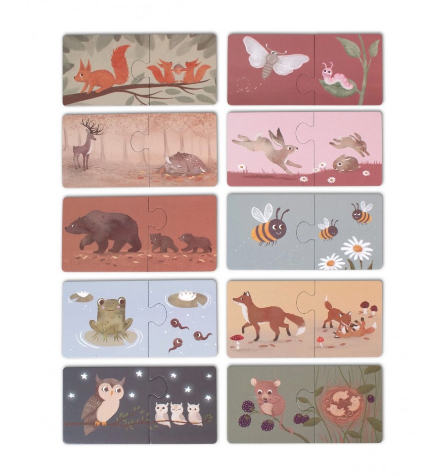 Apprenez à reconnaitre les parents animaux et leurs petits avec ce set de 10 puzzles sur le thème des animaux de la forêt.