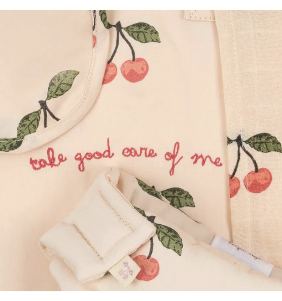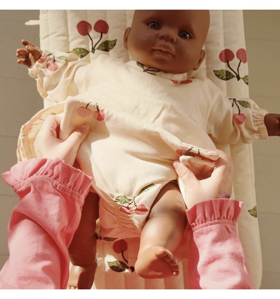 Joli, pratique, tendance, les adjectifs ne manquent pas pour décrire cet ensemble pour poupée décoré de cerises.