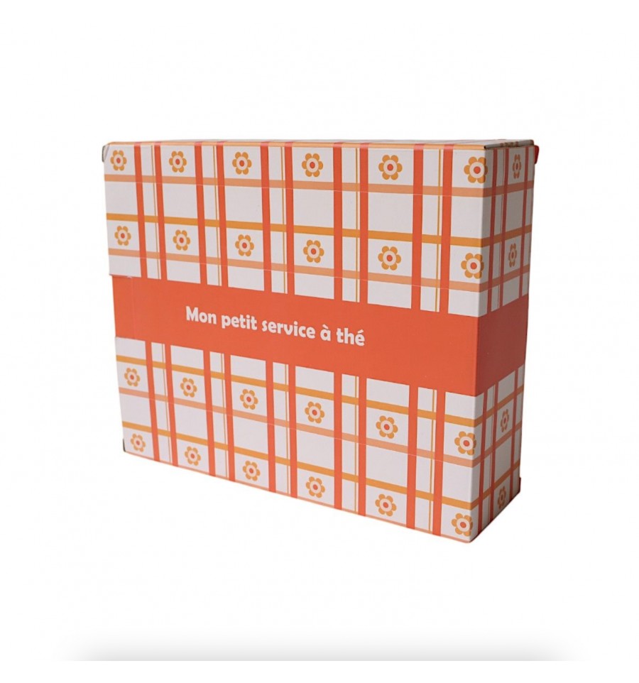 Service à thé tout en bois, présenté dans une jolie boite en carton.