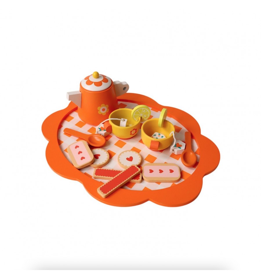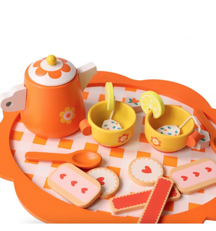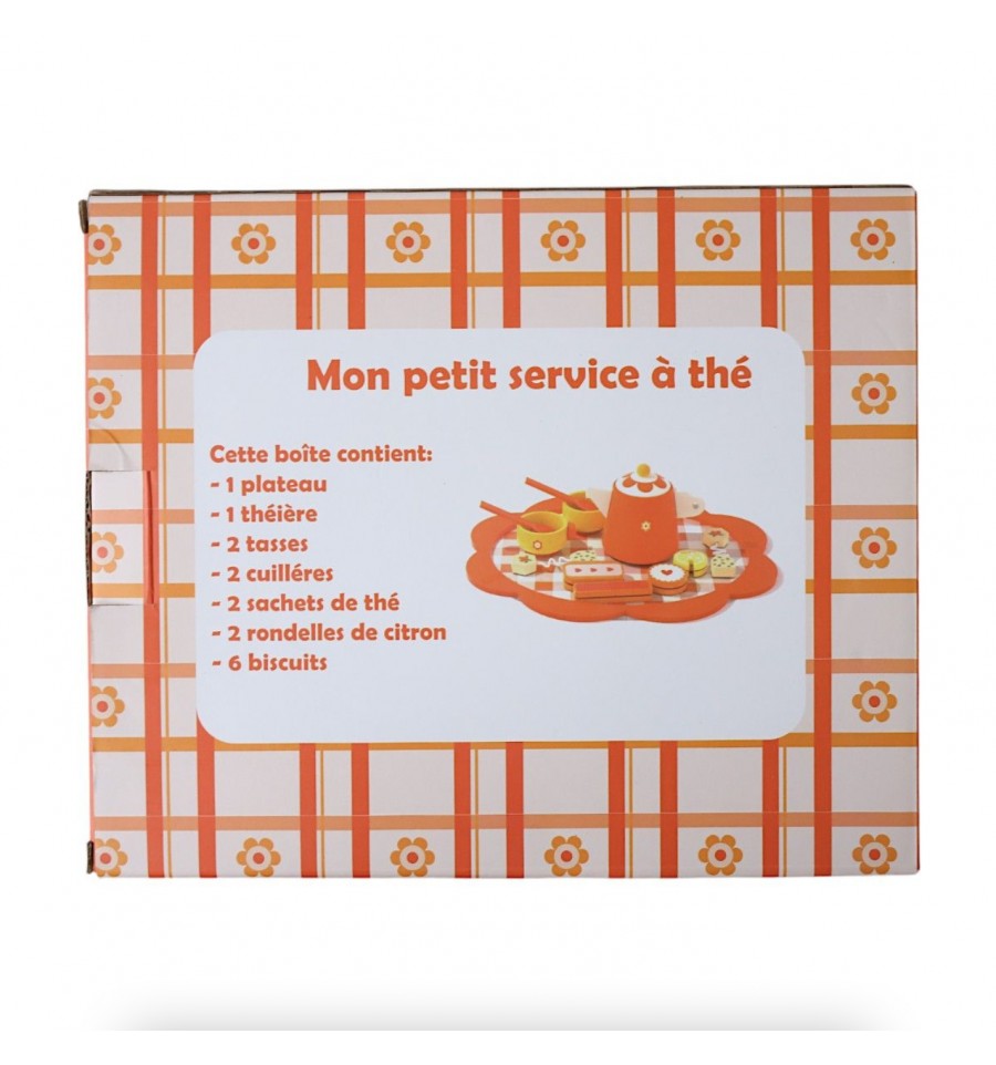 Très complète, elle contient tout le nécessaire pour préparer le thé à ses poupées et jouer pendant des heures : une théière, 2 tasses, 2 cuillères, 2 sachets de thé, 2 rondelles de citron, 6 biscuits et un plateau.