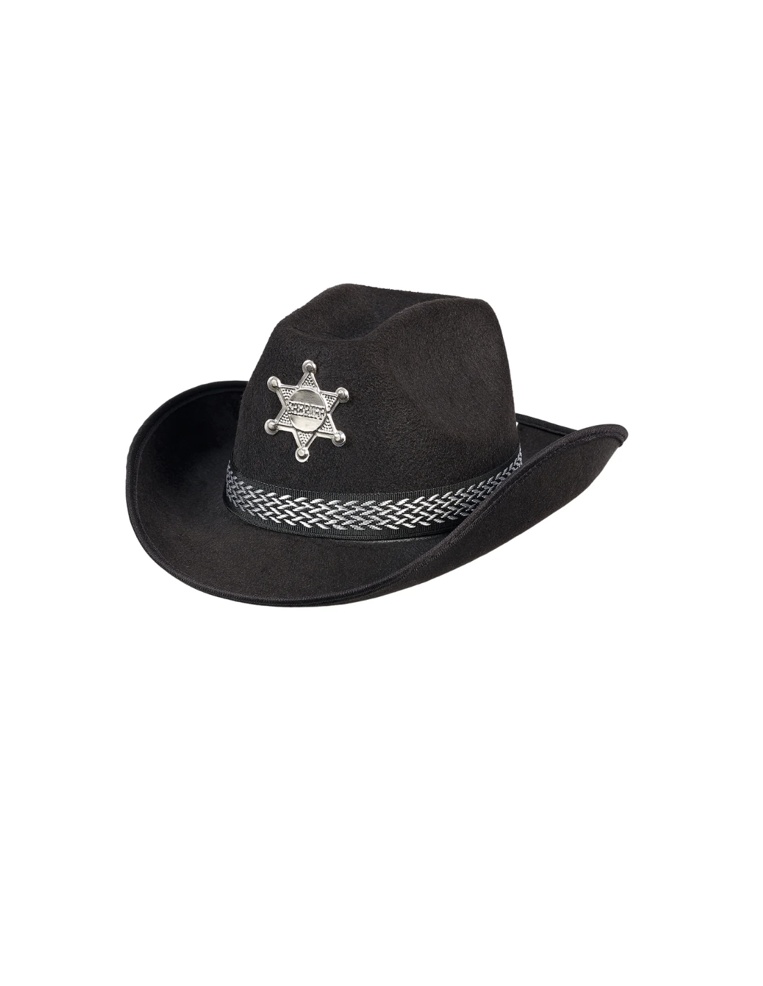 Ce chapeau de shérif est tout noir avec sa longue courroie pour qu'il te s'envole pas avec le vent souvent présent dans le Far West.
