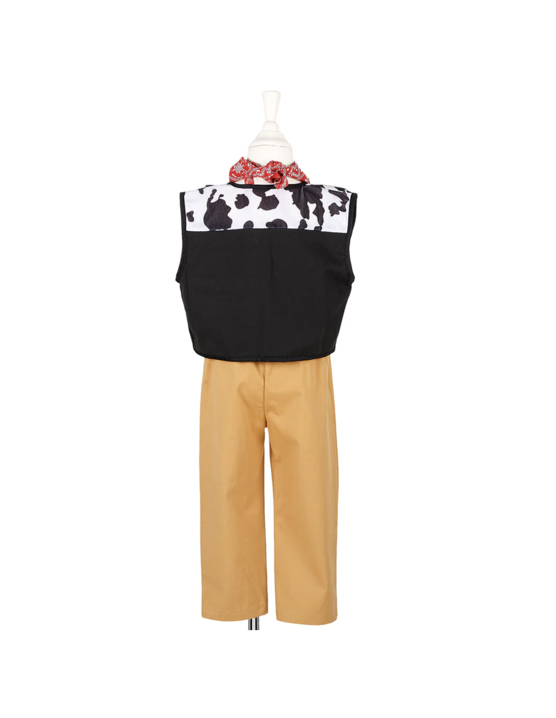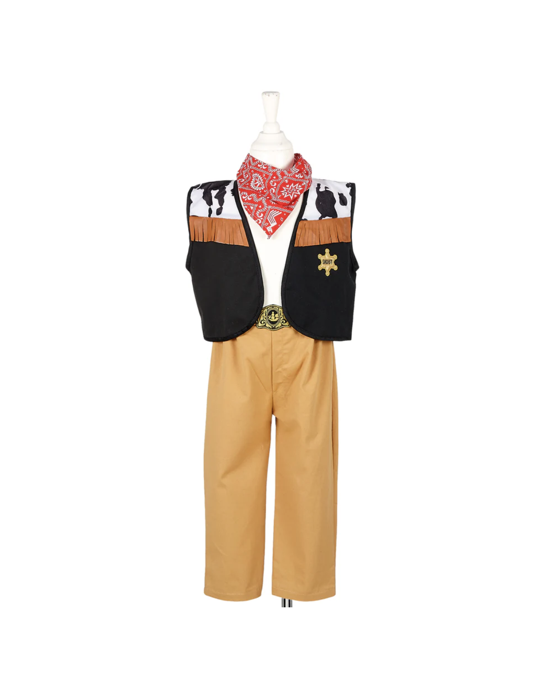 Cet ensemble de déguisement de shérif est magnifique. Pantalon beige, gilet sans manches, noir et peau de vache (fausse !) et ce fameux bandana rouge à caler autour du cou. Parfait !