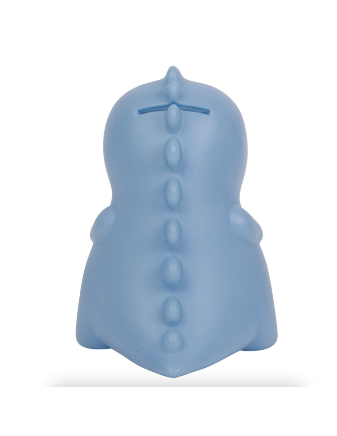Tirelire t-rex (dinosaure) en PVC de couleur bleu/gris avec des joues toutes roses, des minis bras beaucoup trop mignons. La fente pour y glisser les pièces se trouve à l'arrière de sa tête.