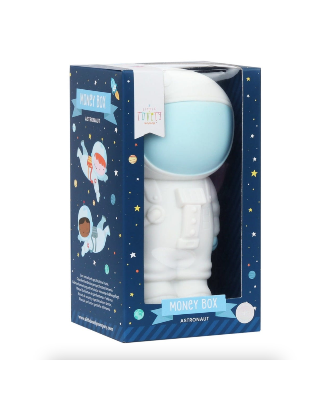 Rencontrez le merveilleux Cosmonaute en forme de tirelire de la jolie marque a Little Lovely Company. Cet astronaute immaculé permettra à vos enfants de glisser leurs pièces de monnaie. Il veillera sur les économies de vos enfants contre toutes attaques de dépenses imprévues.