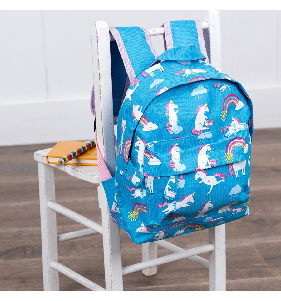 Un petit sac à dos parfait pour la maternelle et pour les loisirs imprimé de licornes sportives qui font du hula hoop, du patin à roulettes dans les nuages.
