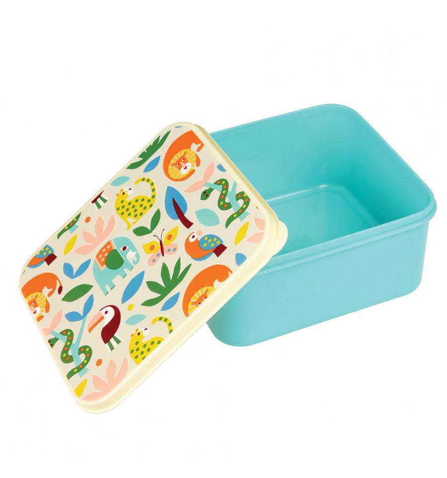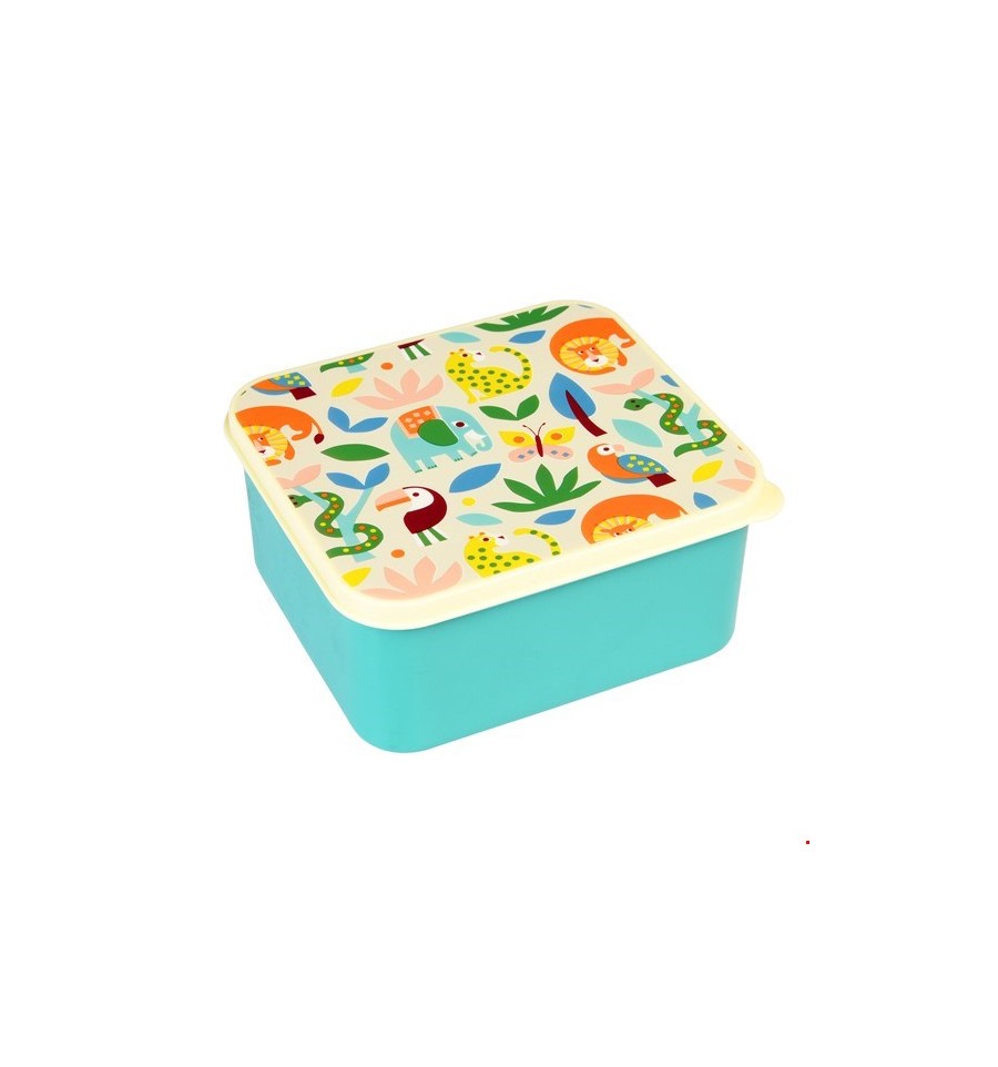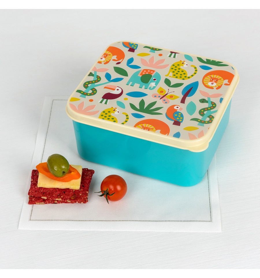 Boîte à goûter avec ses animaux sauvages multicolores : lion, éléphant, toucan, léopard...