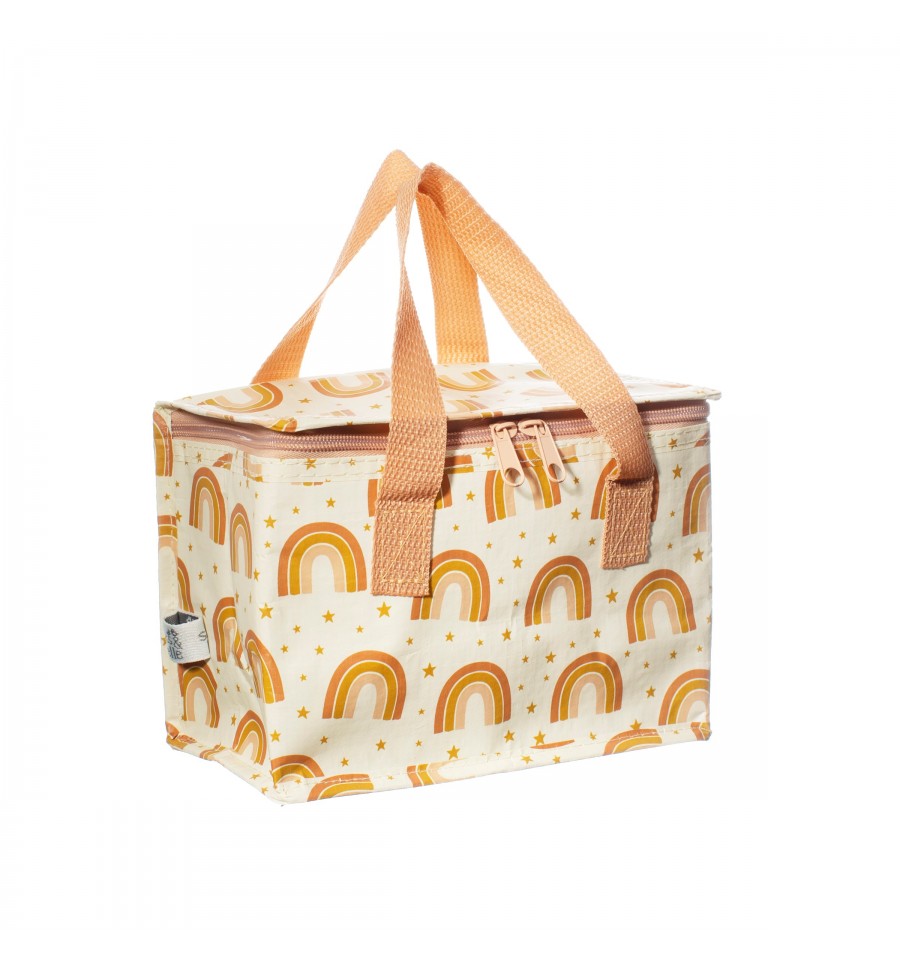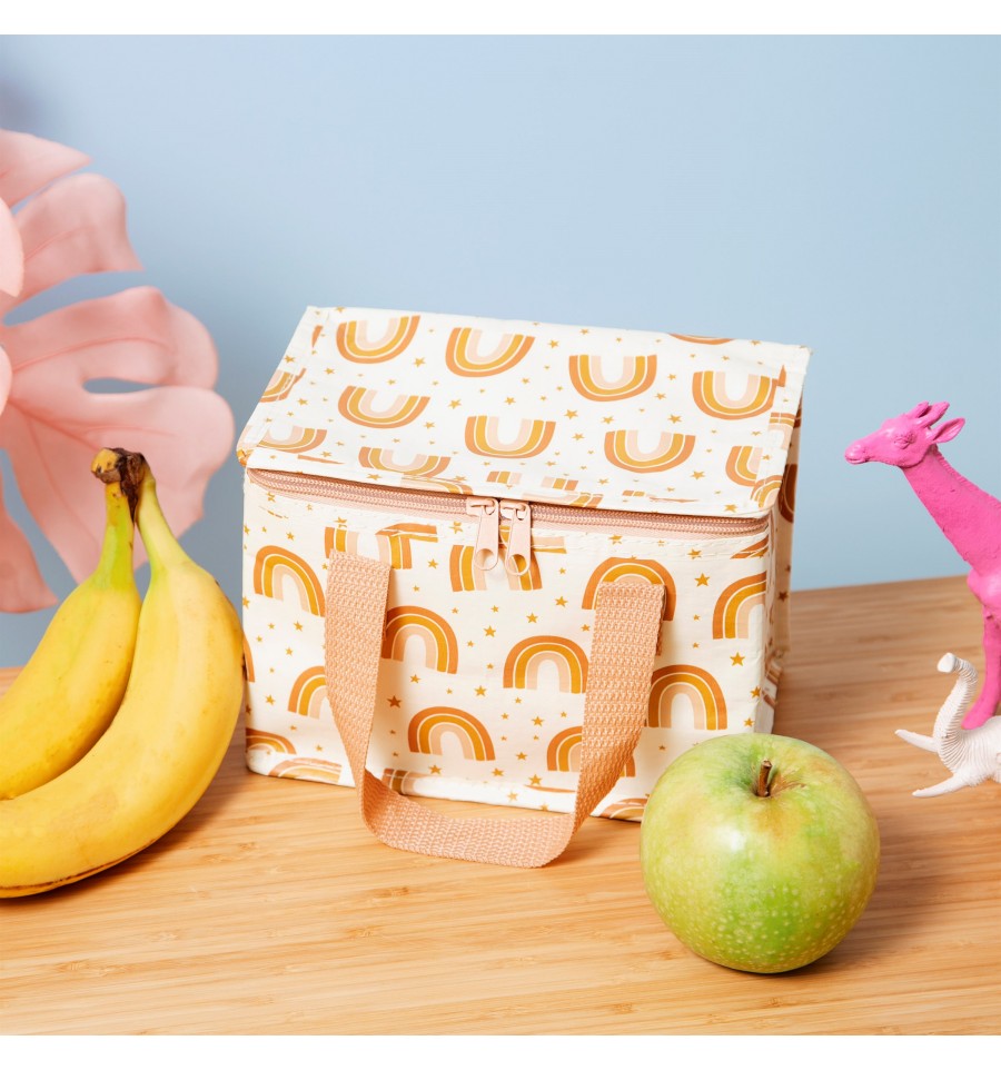 Un petit sac isotherme illustré de nombreux arcs-en-ciel aux couleurs douces et tendances.