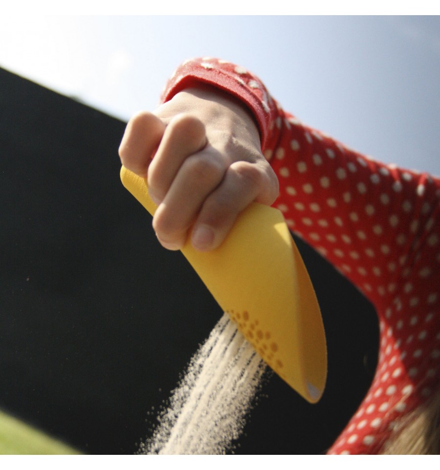 il offre de nombreuses façons de jouer : il devient tour à tour une pelle, un tamis, un entonnoir ou un jeu de balles (raquette).
