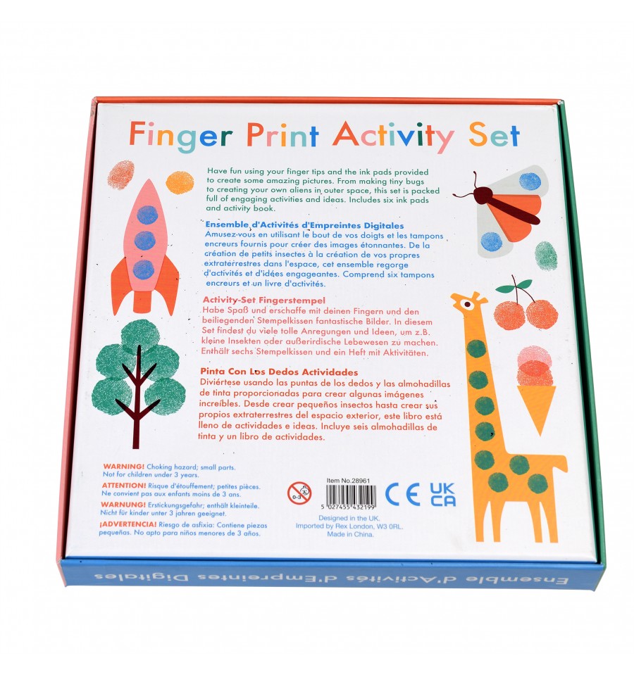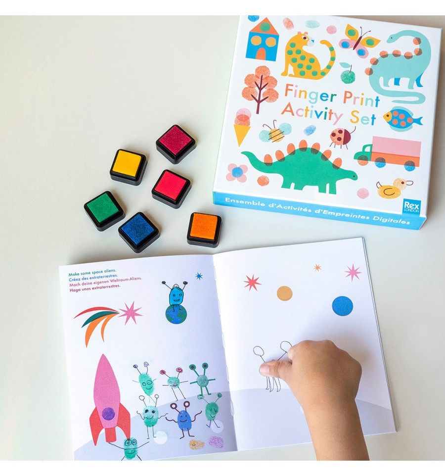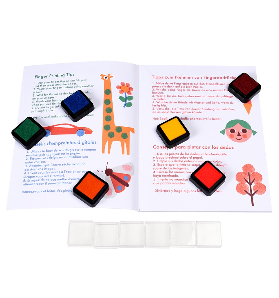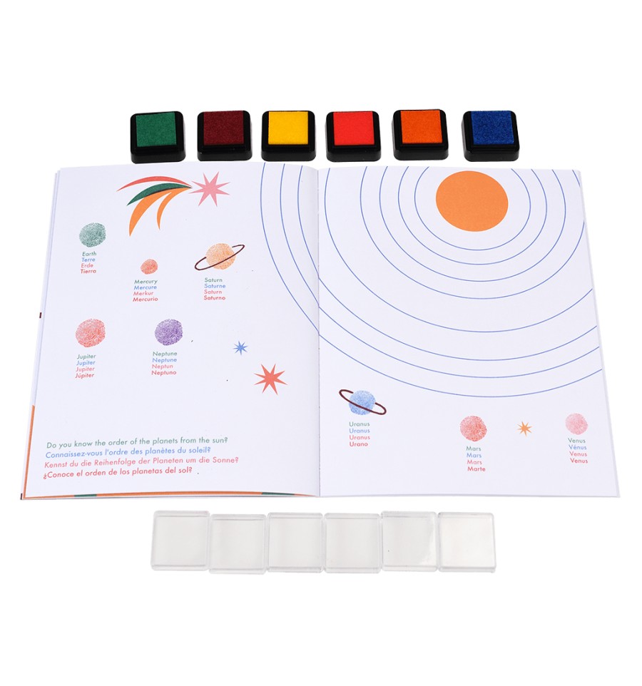 Laissez les enfants mettre leurs bouts de doigts sur les tampons encreurs avant de les appliquer sur les pages du cahier pour créer de jolis décors amusants : les extraterrestres, le système solaire, les dinosaures ou encore des petits insectes.