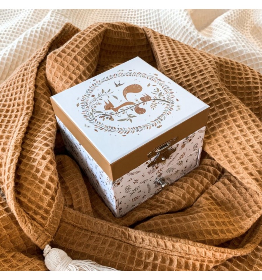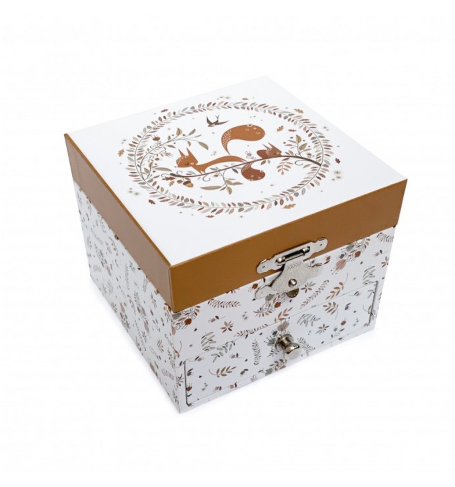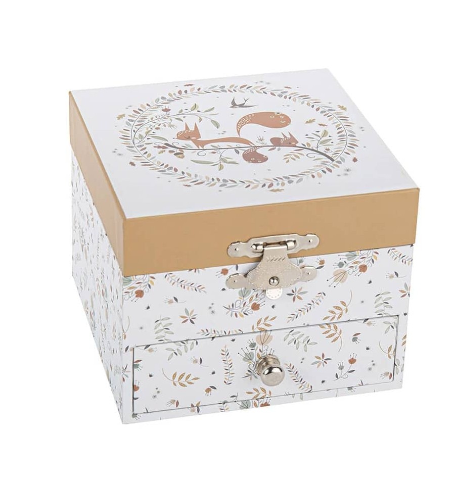 Très appréciée par les jeunes filles, les boîtes à bijoux musicales permettent aussi de décorer une chambre d’enfant de manière très personnalisée. Ici, avec ses motifs automnaux et son petit écureuil malicieux, la boîte apporte une touche naturelle et très douce.