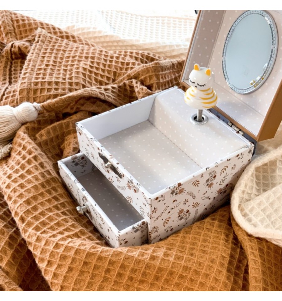 Elle combine l'utilité d'une boite de rangement à celle d'une boite à musique adorable : à l'intérieur, regarde le petit chat s'agiter sur son ressort au son de la mélodie !
