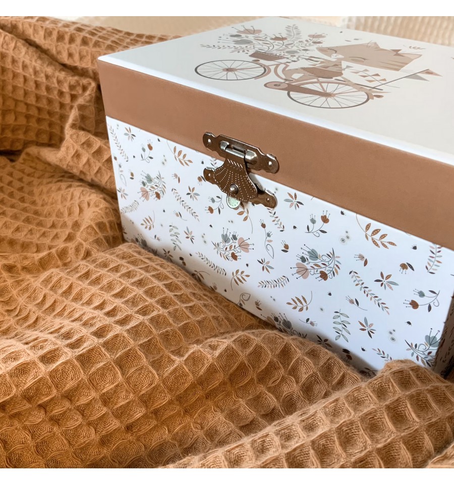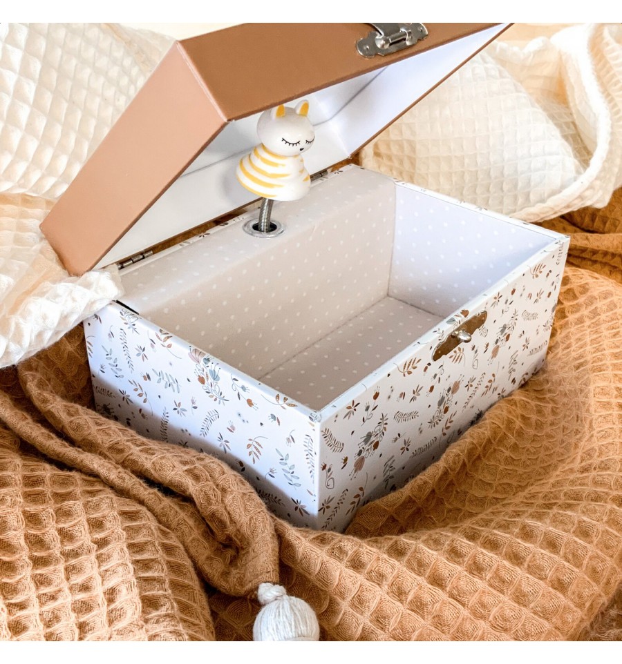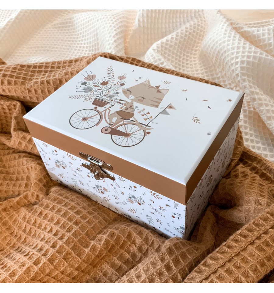 Très appréciée par les jeunes filles, les boîtes à bijoux musicales permettent aussi de décorer une chambre d’enfant de manière très personnalisée. Ici, avec ses motifs automnaux et son petit chat à vélo, la boîte apporte une touche naturelle et très douce.