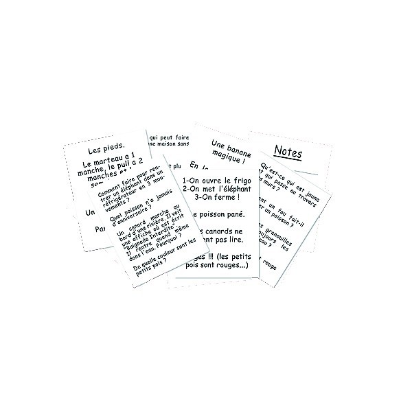 Chaque carte contient plusieurs devinettes courtes et les réponses sont au dos. Pour les enfants bien sûr, quoi que...
