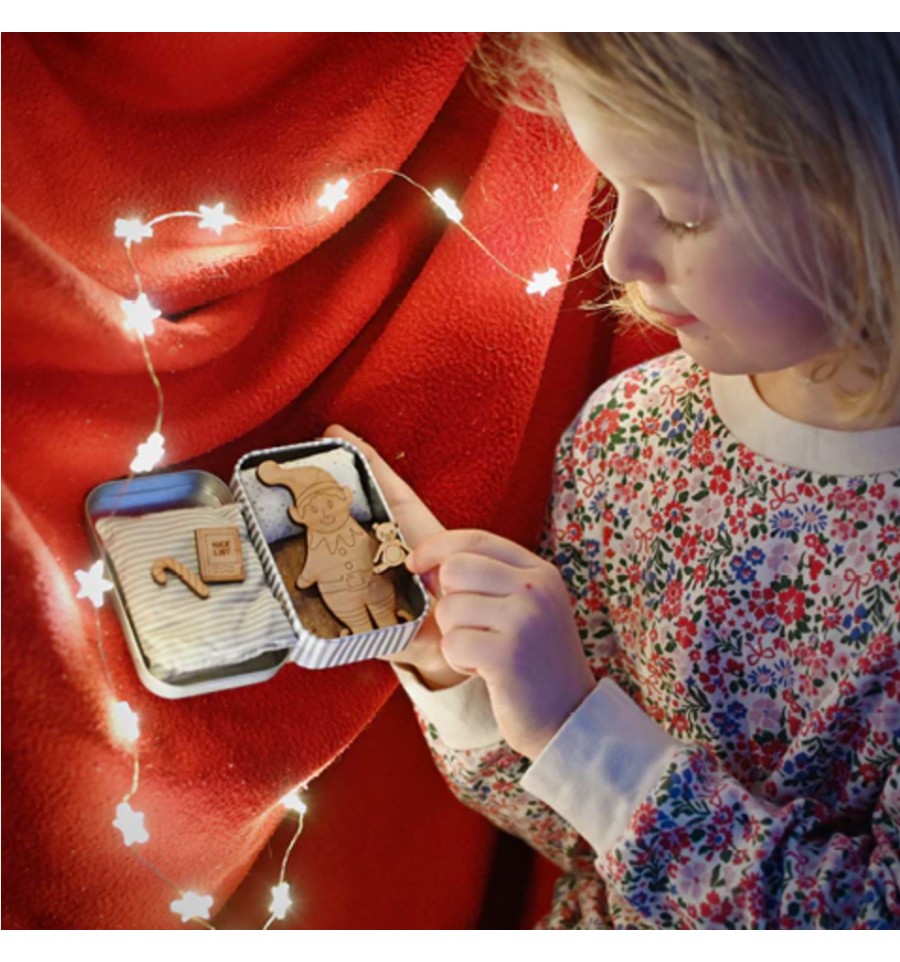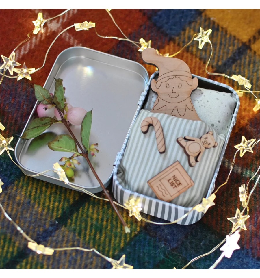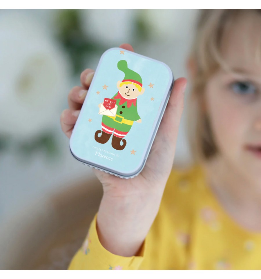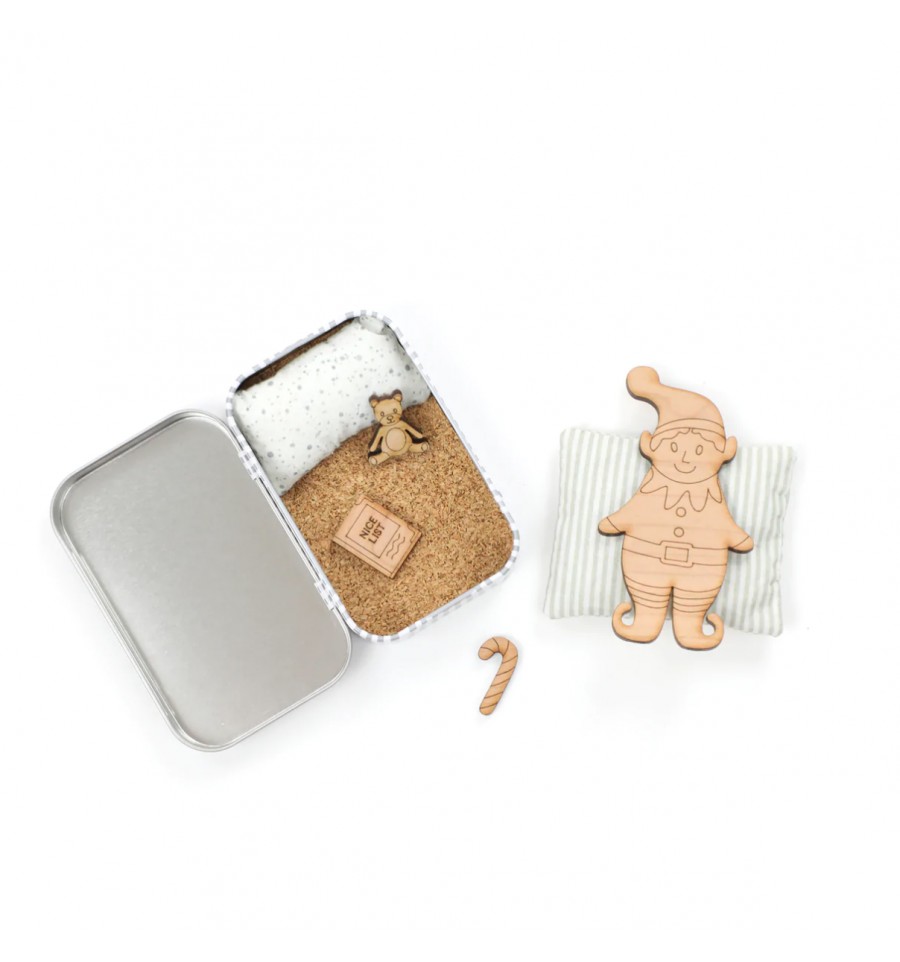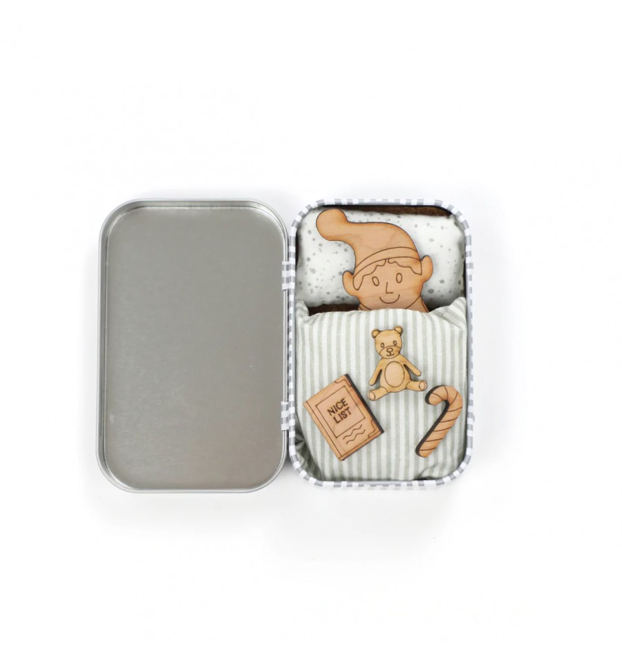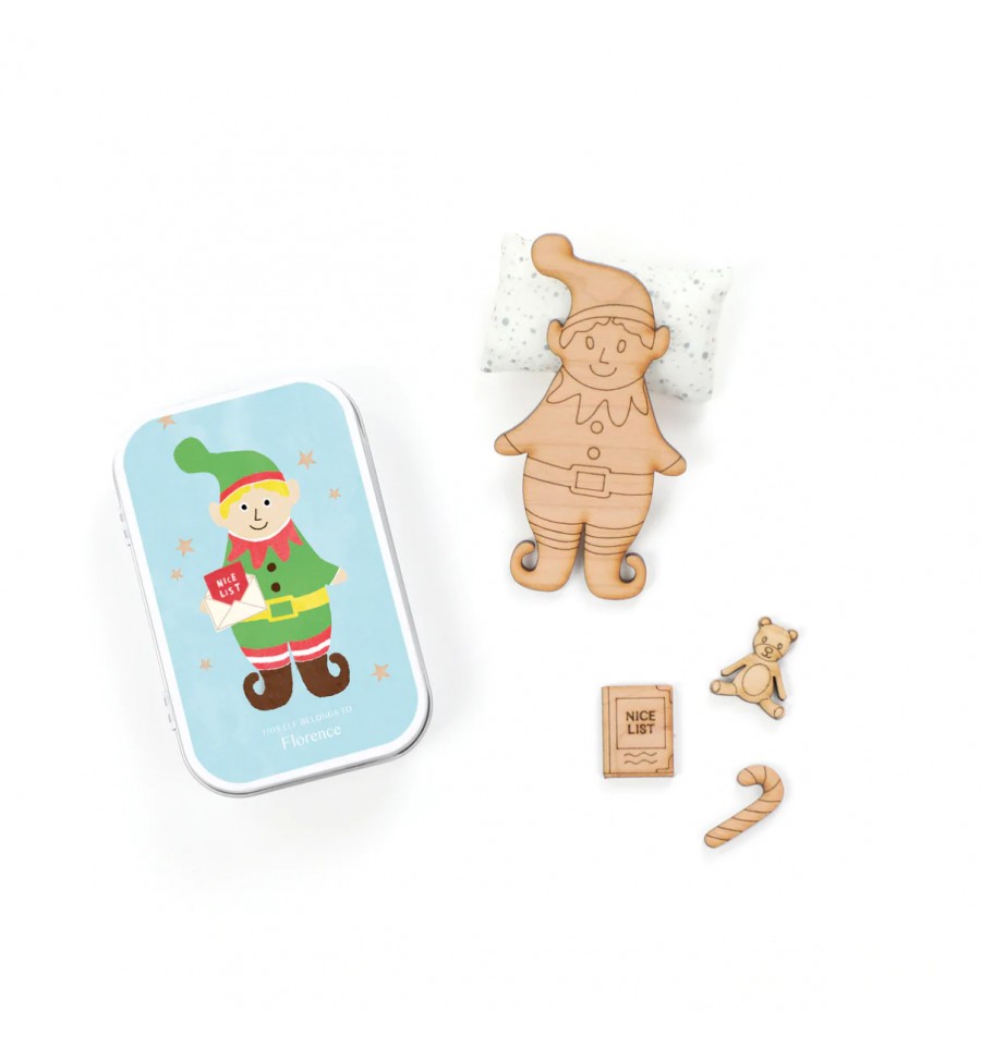 Dans cette boite en métal, vous trouverez un petit elfe en bois à personnaliser... et à chouchouter ensuite : avec son oreiller, sa couette et son doudou, il deviendra le meilleur ami de vos enfants.