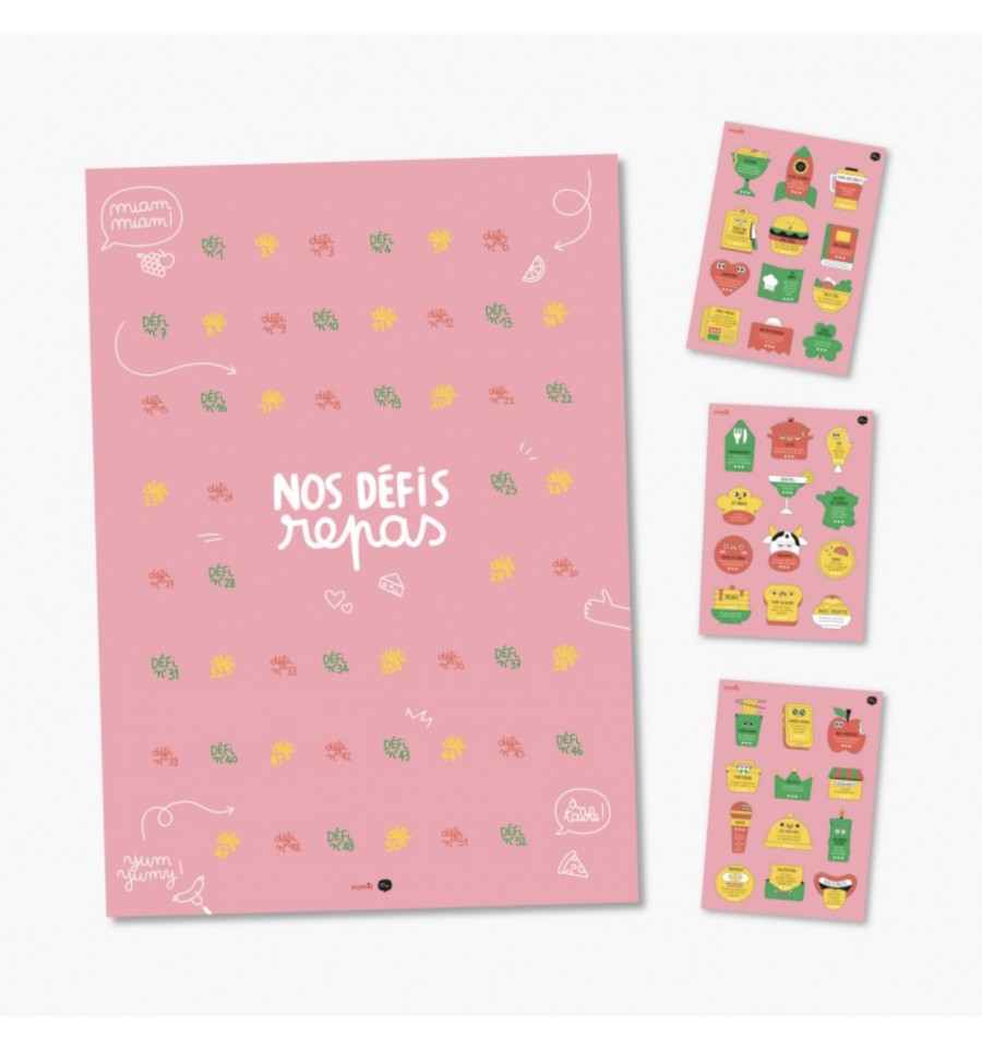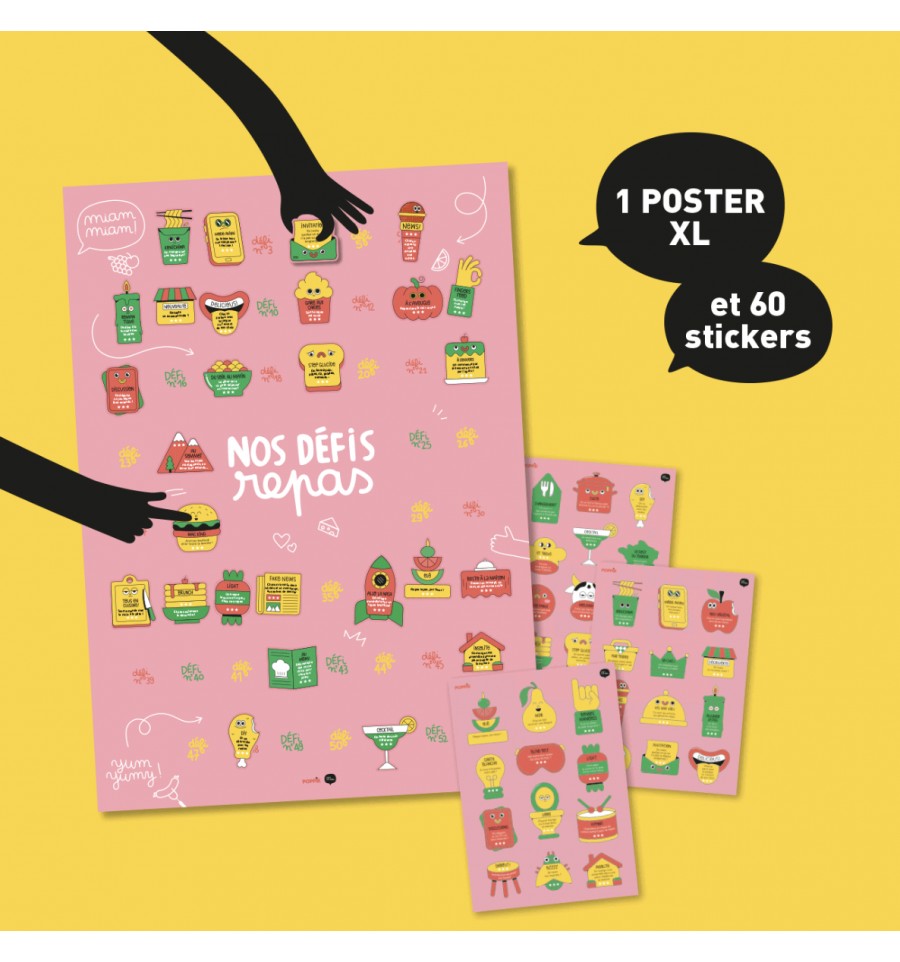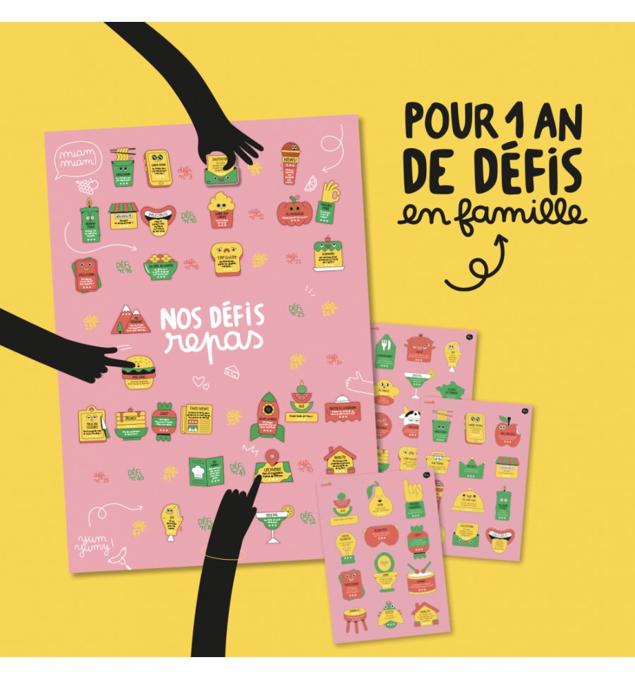 Découvrez un poster à partager en famille. Choisissez ensemble 52 stickers défis à essayer ! Un diner à la bougie ? un diner à manger avec les doigts etc... Mille idées pour que le repas devienne un moment génial de complicité, d'originalité et de partage rigolo !
