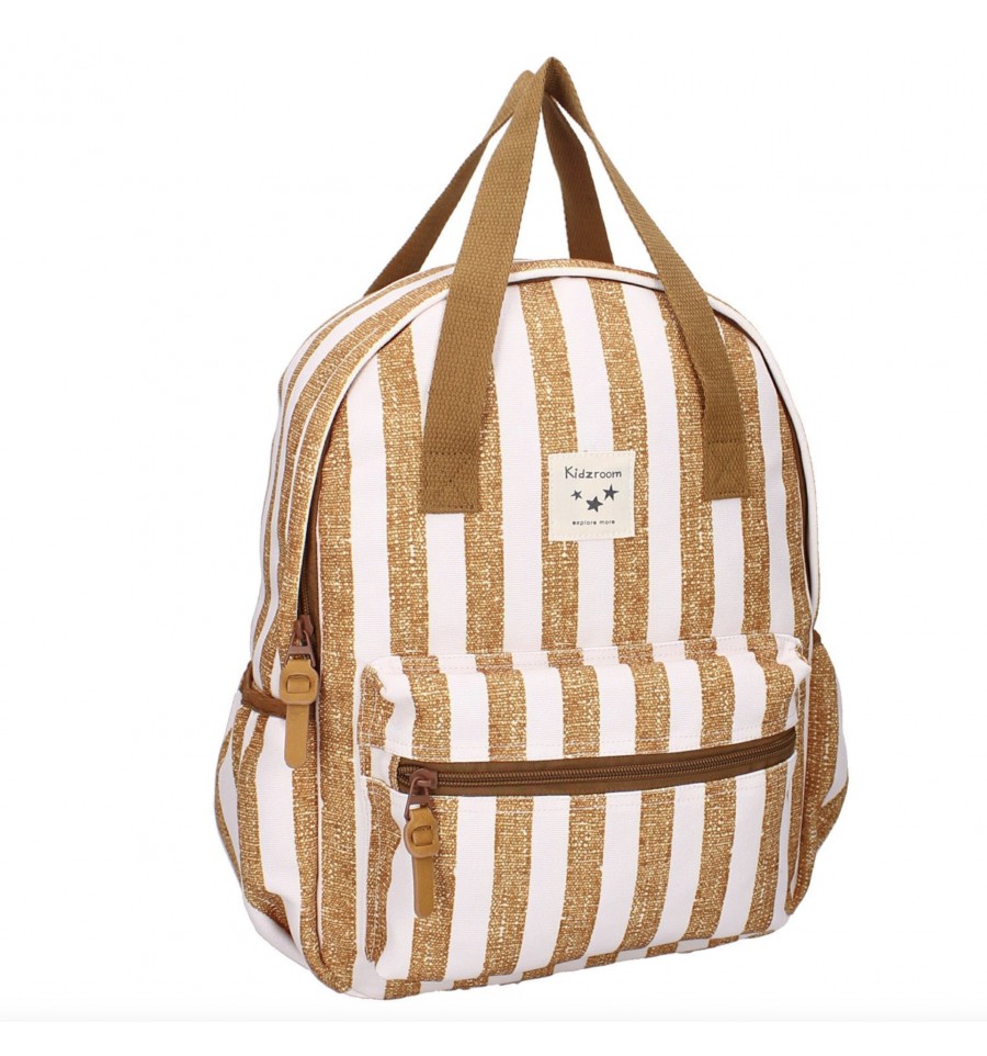 Ce sac à dos à rayures blanc et caramel est idéal pour accompagner votre enfant dans ses nouvelles aventures.