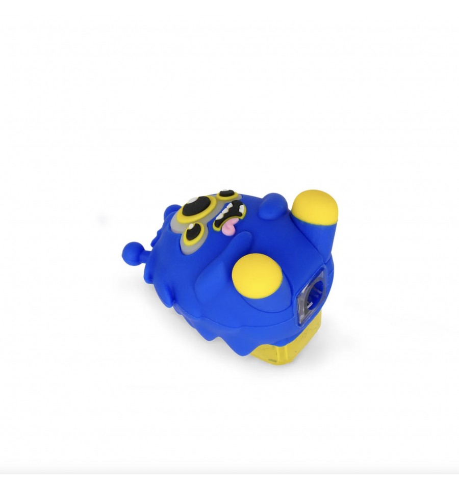 Ce monstre très réaliste, bleu aux yeux jaunes, cache dans son dos un taille crayon ainsi qu'un réservoir : Pratique !