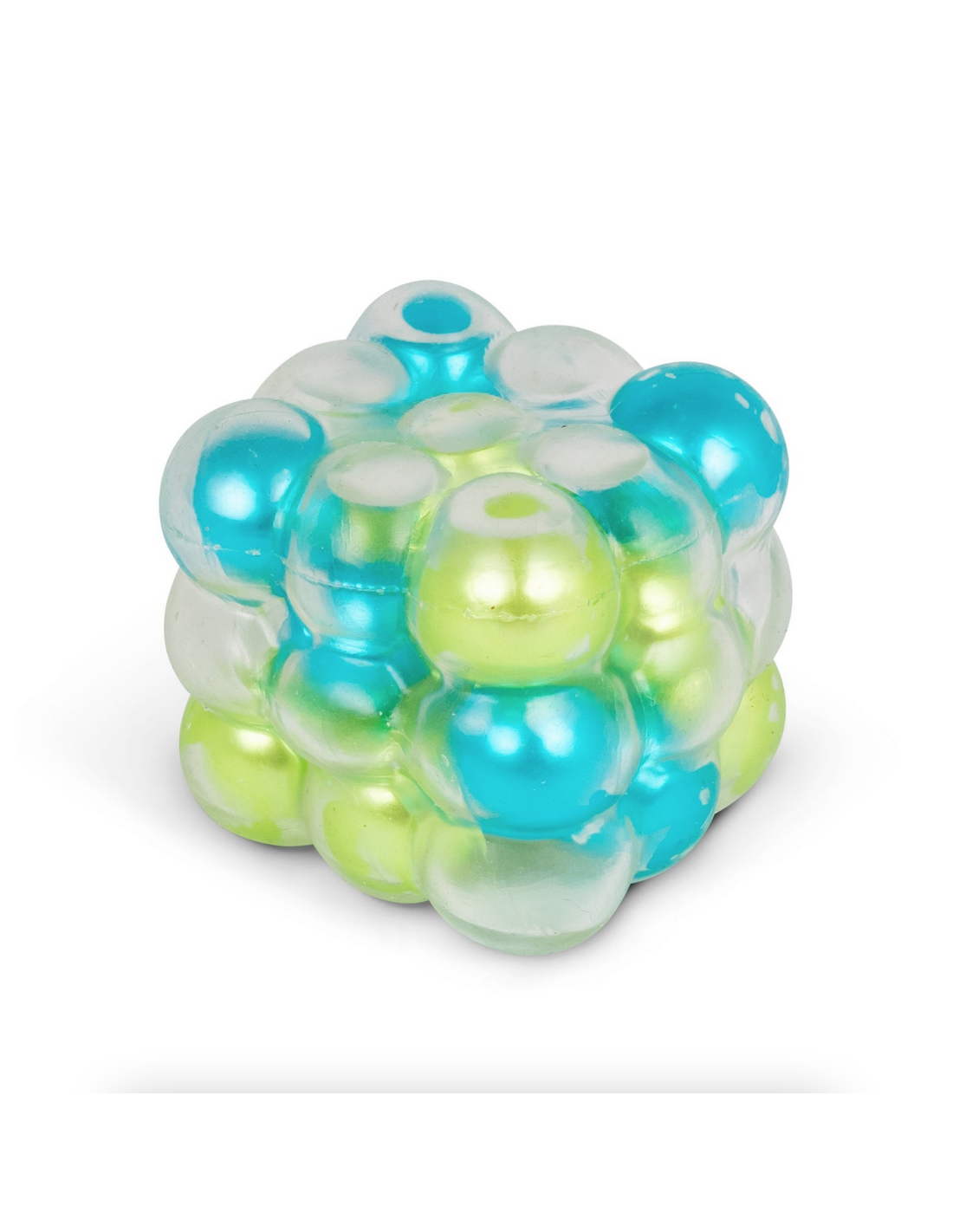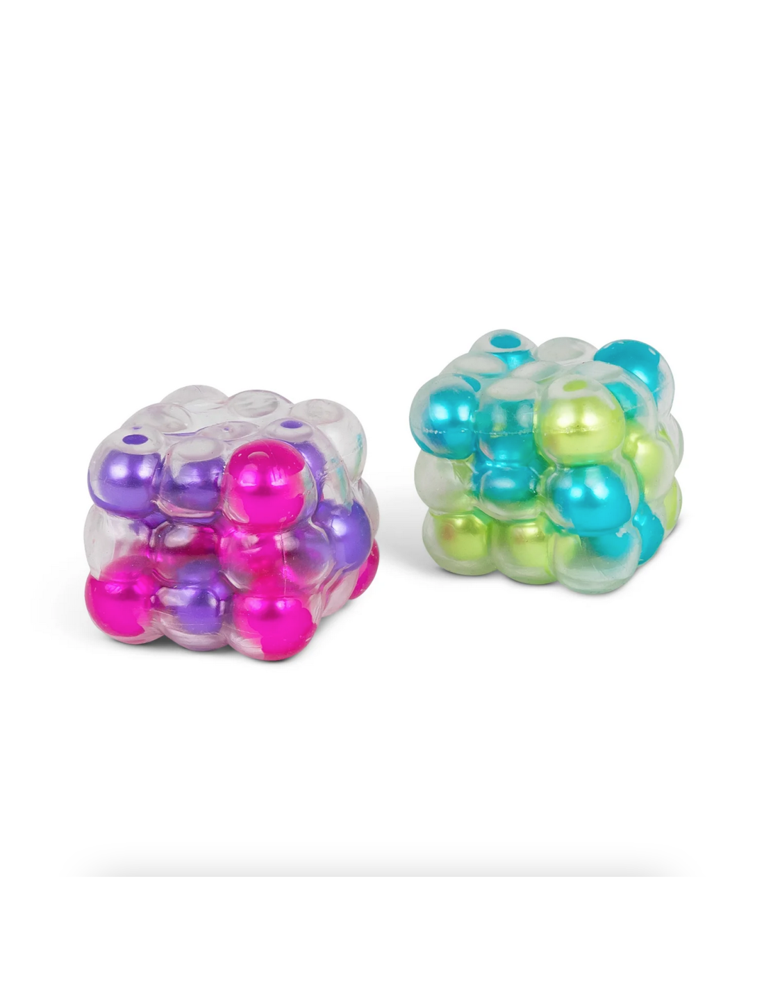 Cette balle anti-stress en forme de cube est remplie de billes multicolores.