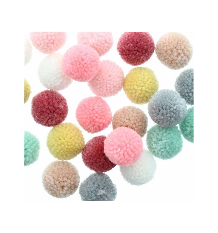 Assortiment de 24 pompons assortis (3 pompons blanc, 3 rose blush, 3 rose layette, 3 rose, 3 vieux rose, 3 mint, 3 jaune pâle et 3 gris pâle).