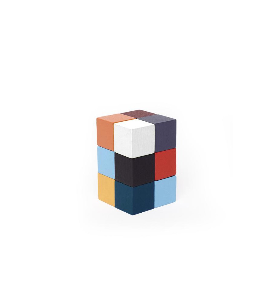Casse-tête en bois constitué de 12 cubes multicolores reliés entre-eux par un élastique.