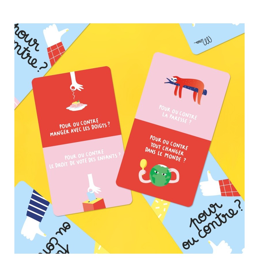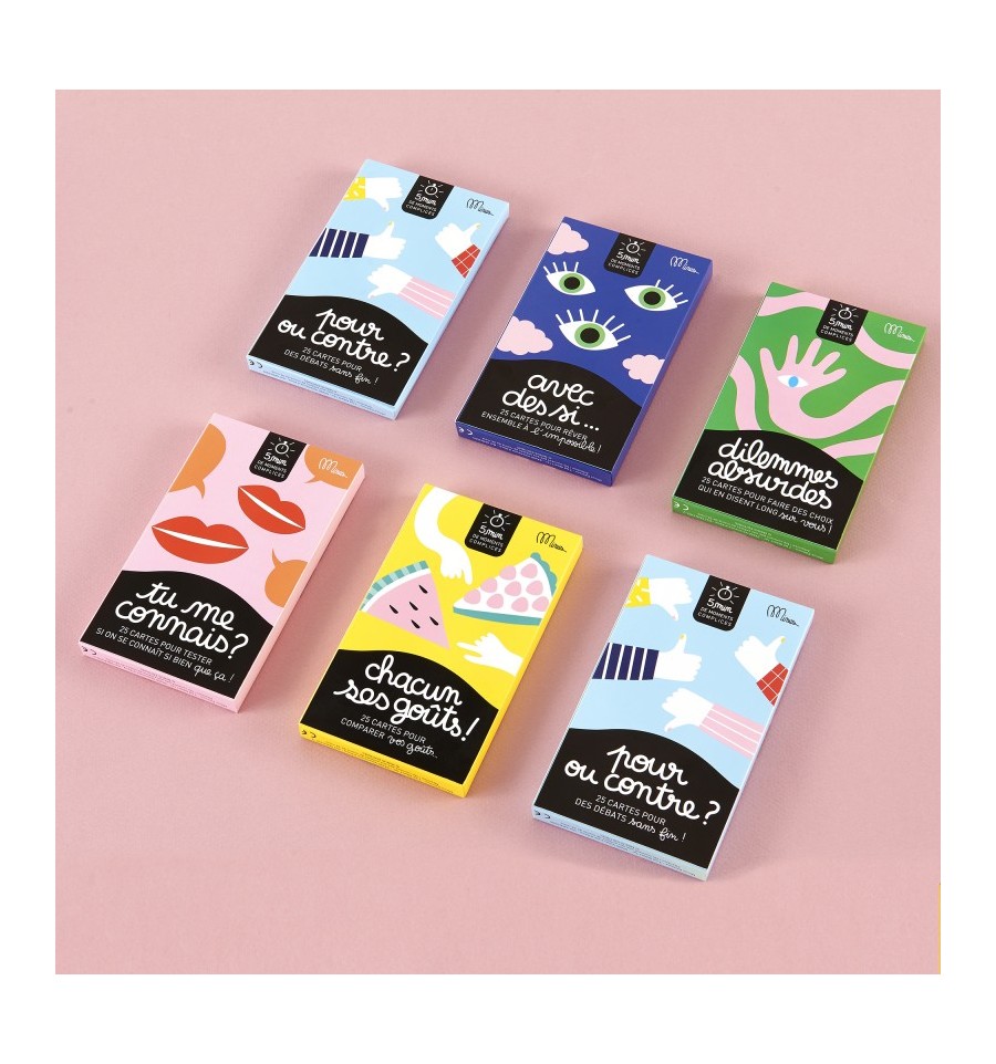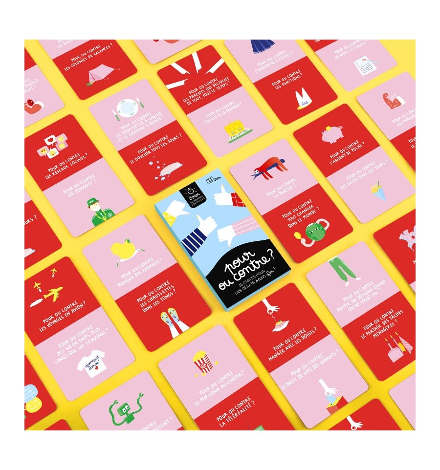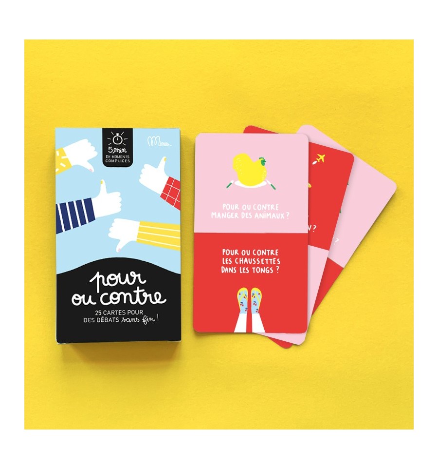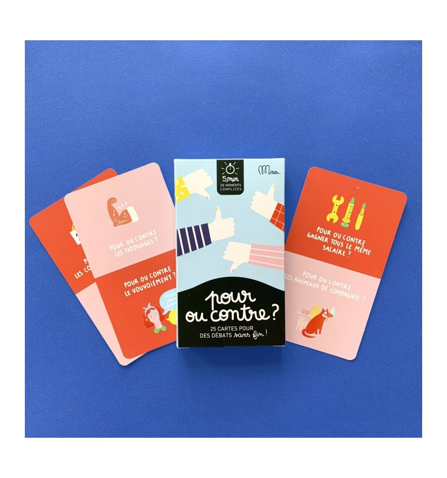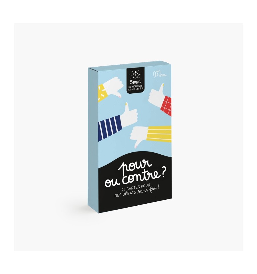 Ce jeu composé de 25 cartes est idéal pour s’amuser à débattre indéfiniment et découvrir que souvent rien n’est tout blanc ou tout noir ! Prêts pour des discussions super sérieuses ou un peu farfelues ? Au programme : débats et fous rires garantis pour faire pétiller les moments ensemble.