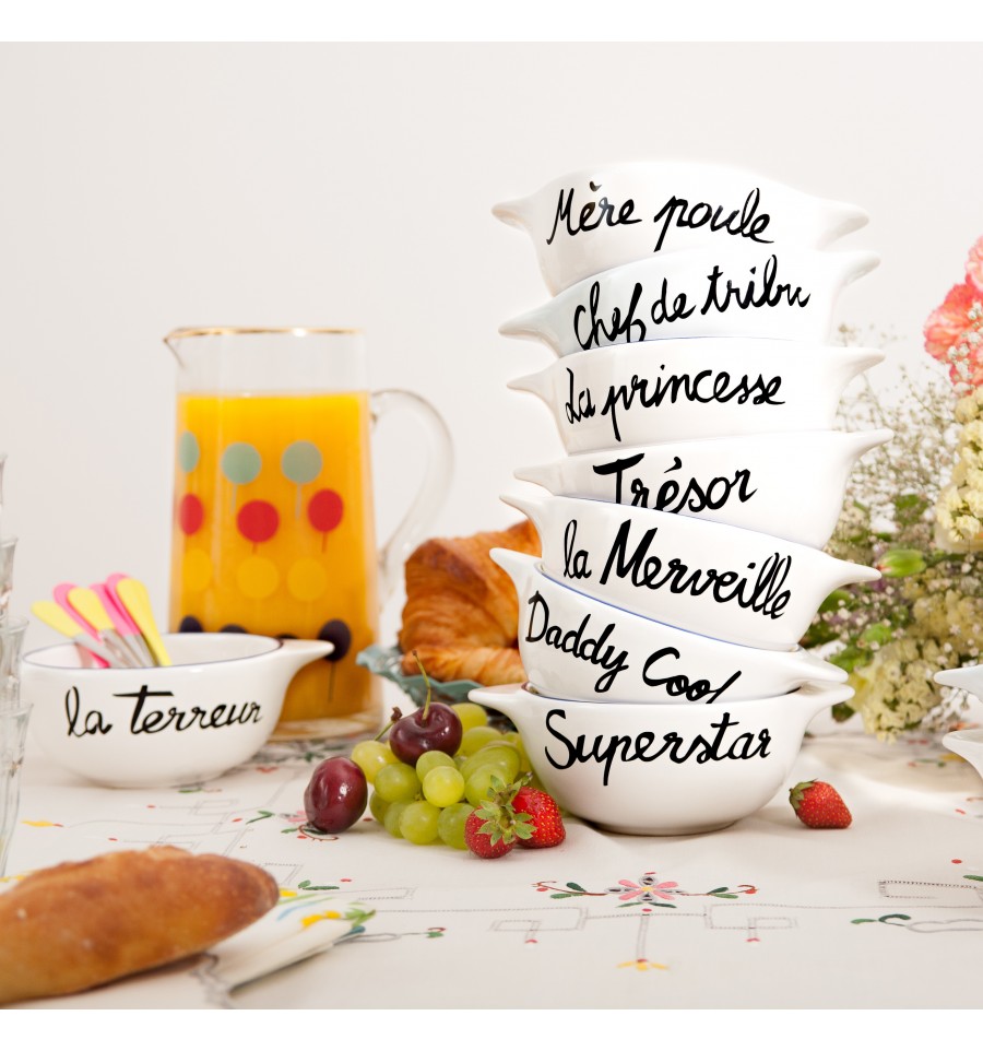 Ce bol à oreille inspiré des bols bretons traditionnels a été modernisé : traditionnellement représenté avec un prénom, les créatrices de la marque française Pied de Poule revisite le bol breton et nous présente les membres de sa grande famille !