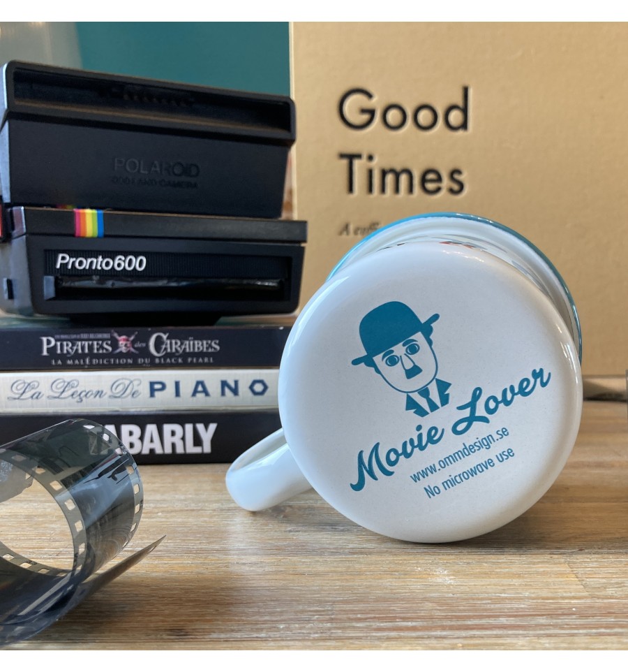 Une tasse en tôle émaillée dessinée par Ingela Arrhenius avec les représentations de 9 personnages de films célèbres : Indiana Jones, Amélie Poulain, Charlot, Bridget Jones, James Bond, Mia Wallace & Vincent Vega (Pulp Fiction), Alex Foley (Le Flic de Beverly Hills) et Sally Bowles (Cabaret).