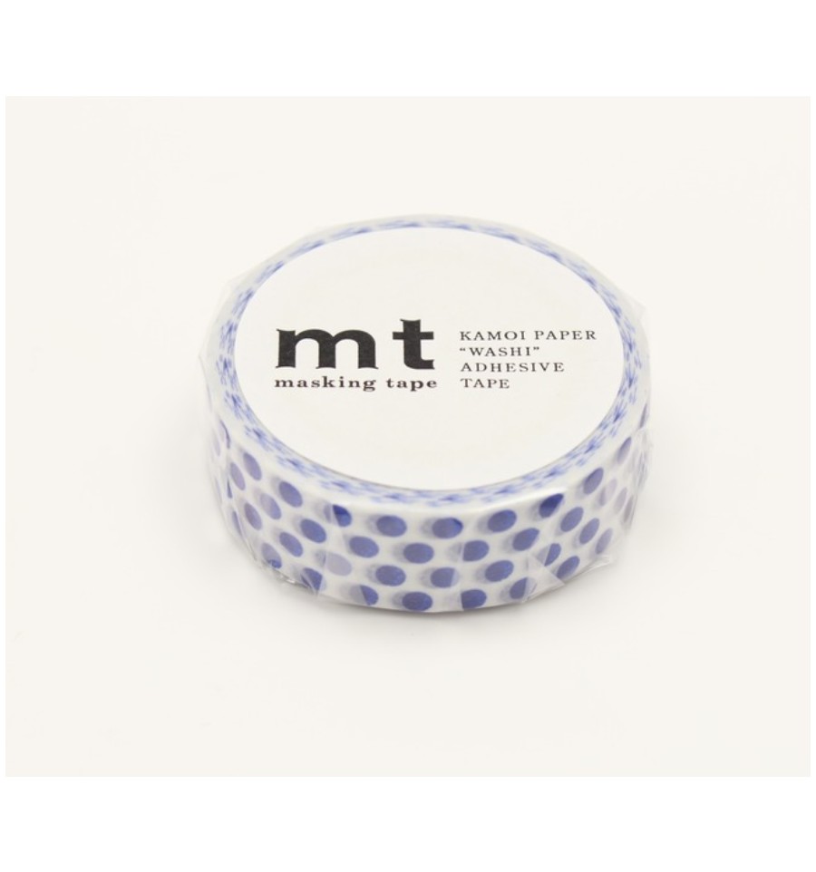 Un rouleau de masking tape à pois bleu foncé qui fait 15 mm de large sur 7 m de long.