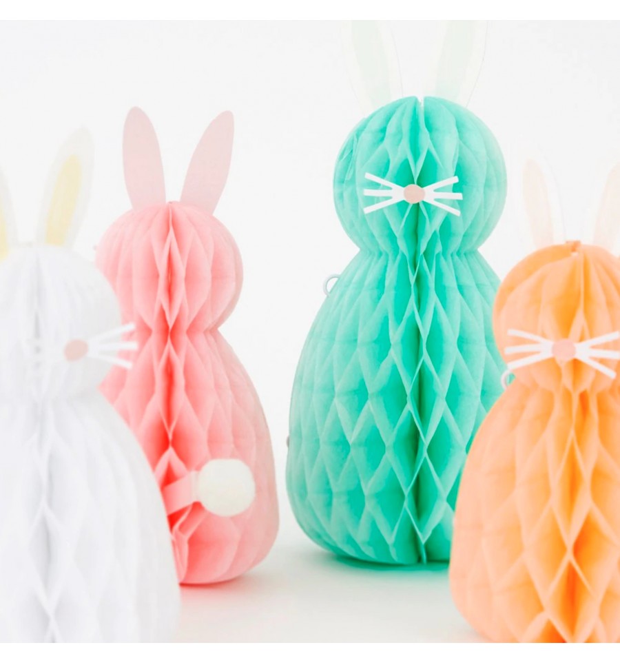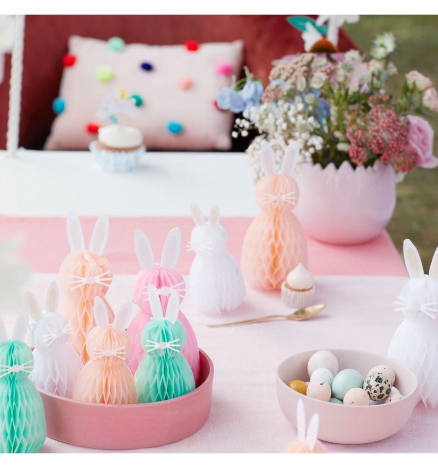 Ce set de 8 lapins en papier nid d'abeille sera parfait pour décorer votre table de Pâques.