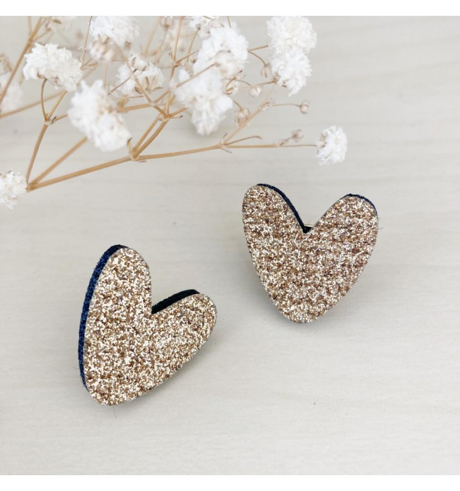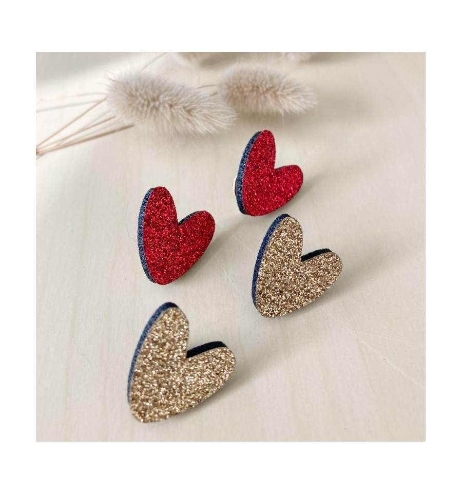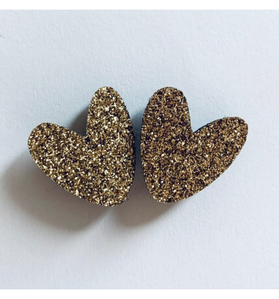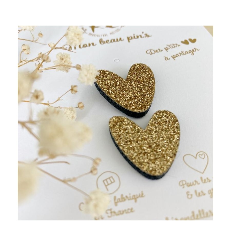 Ce duo de pin's en forme de coeurs dorés est en feutrine et en paillettes.