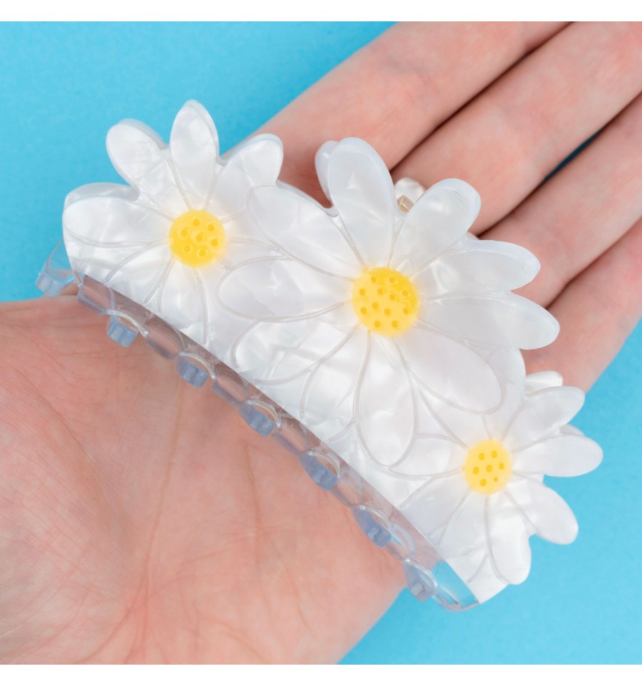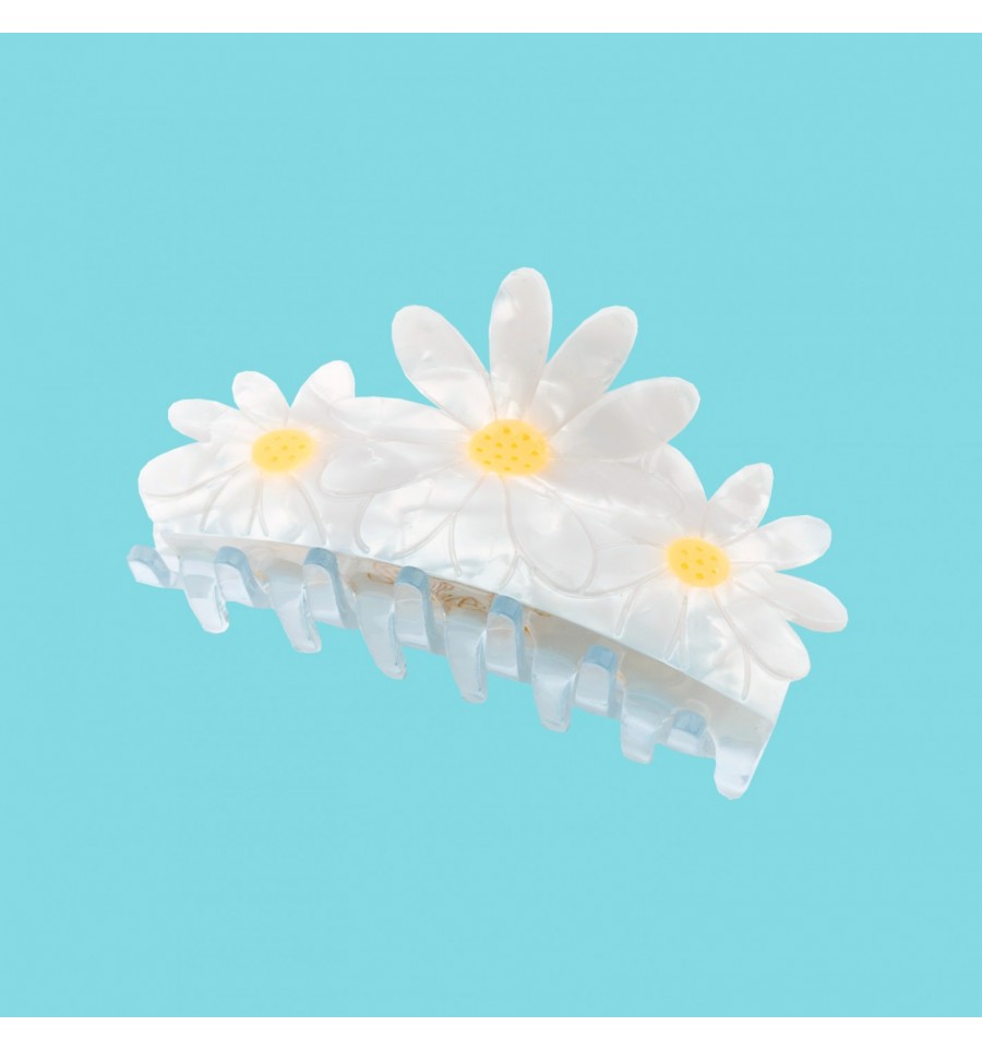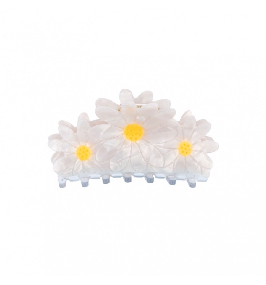 Joliment colorée de trois Pâquerettes nacrées blanches aux pistils jaunes vifs, cette pince avec ces grandes dents permet de tenir tous les cheveux même les plus rebelles !
