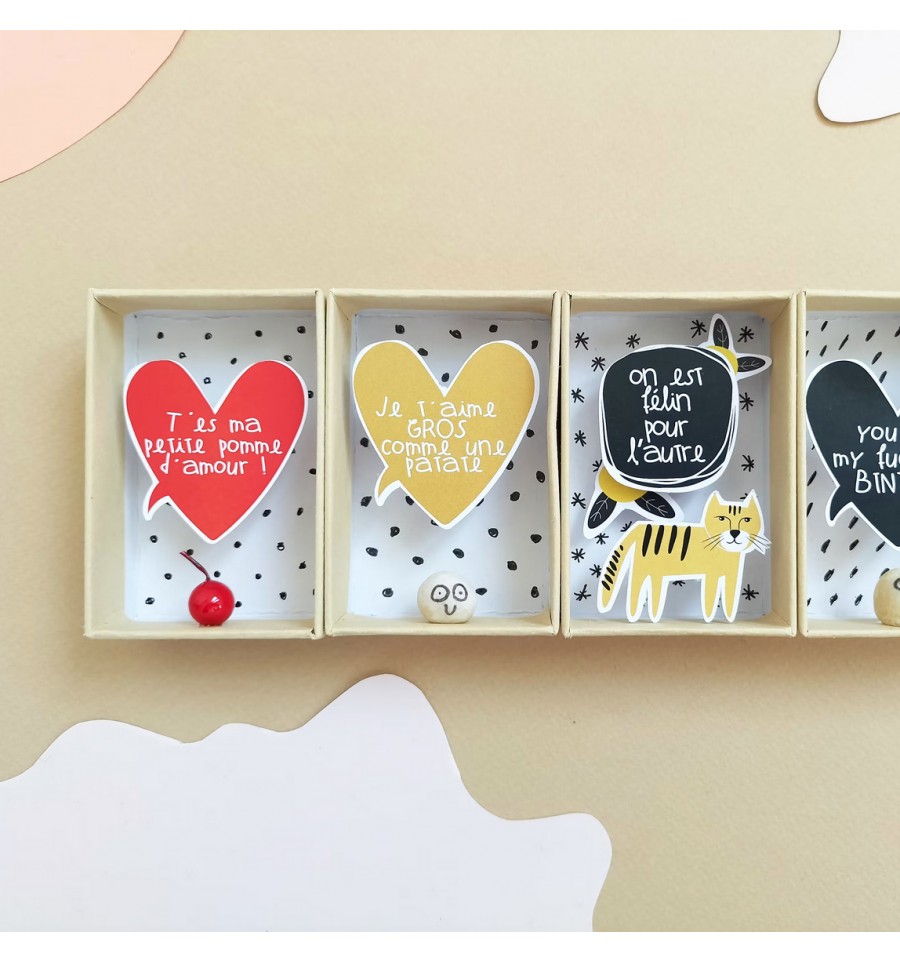 Dans cette petite boite en carton se cachent un décor en papier en 3D et une petite pomme rouge avec le message "T'es ma petite pomme d'amour !".