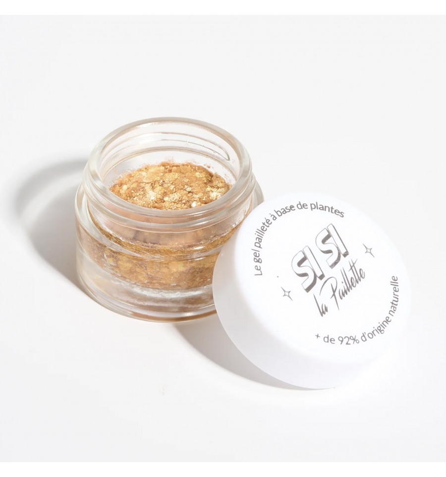 Le gel pailleté imaginé par Sisi La Paillette associe notre ingrédient-soin préféré, le karité, et leur paillettes iconiques Queen du Désert (mélange de mélange caramel, or pâle et cuivré) pour une application simple et rapide.