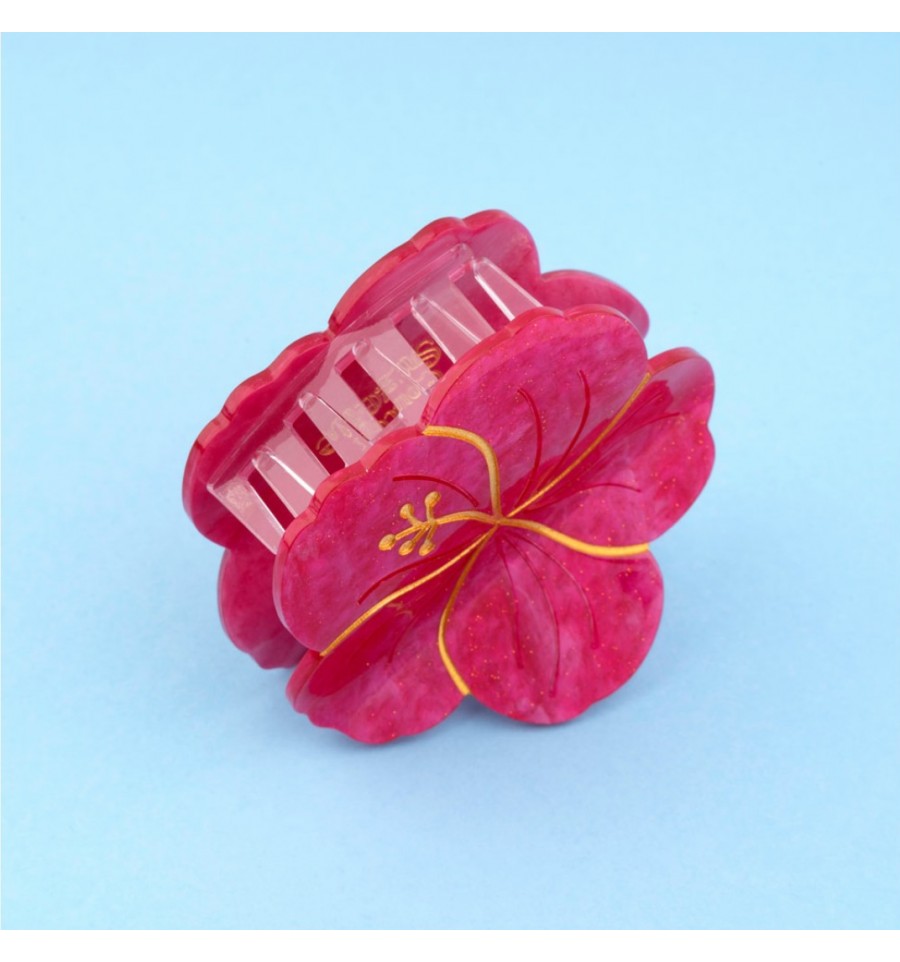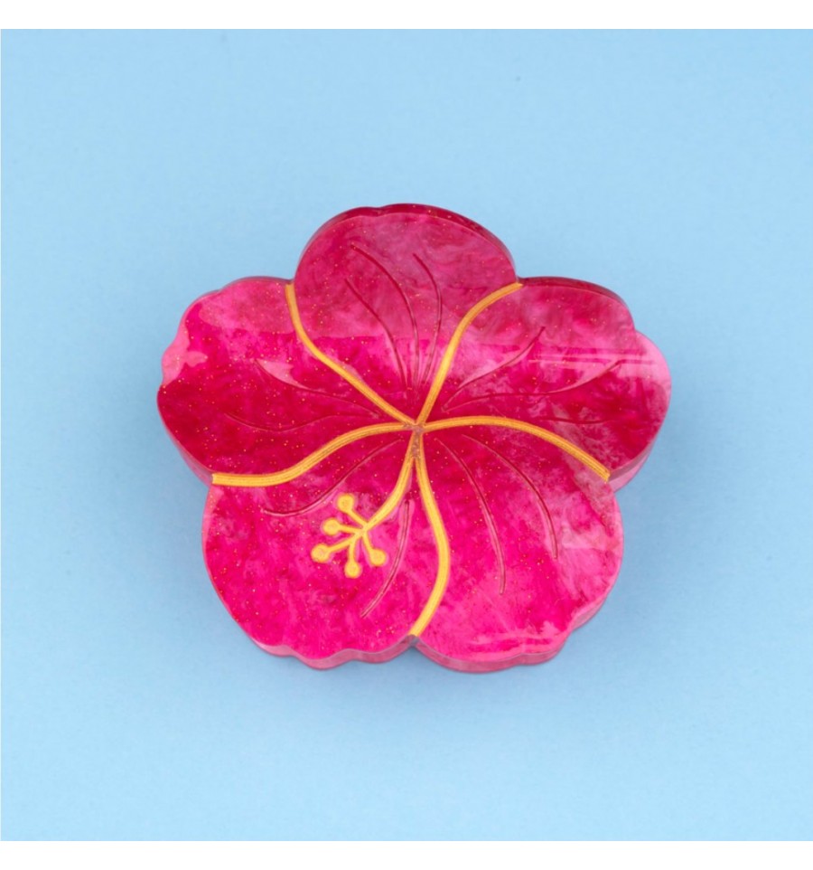 Cette jolie pince à cheveux en forme d'hibiscus rose fuchsia à paillettes est signée Coucou Suzette.