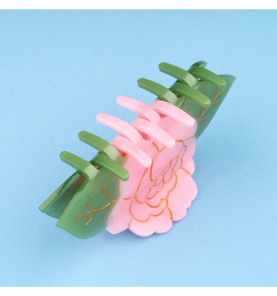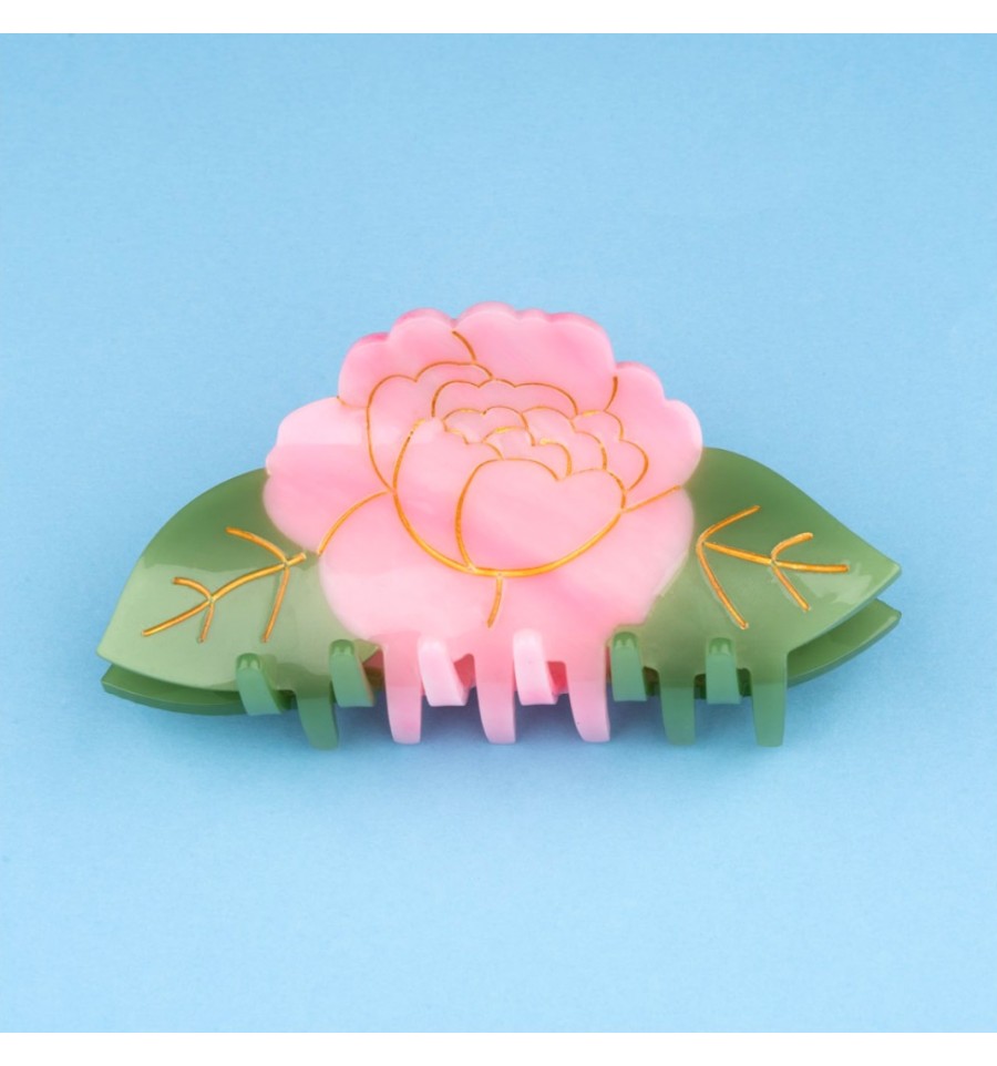 Cette jolie pince à cheveux en forme de pivoine, avec ses couleurs rose et vert lumineuses, est signée Coucou Suzette.