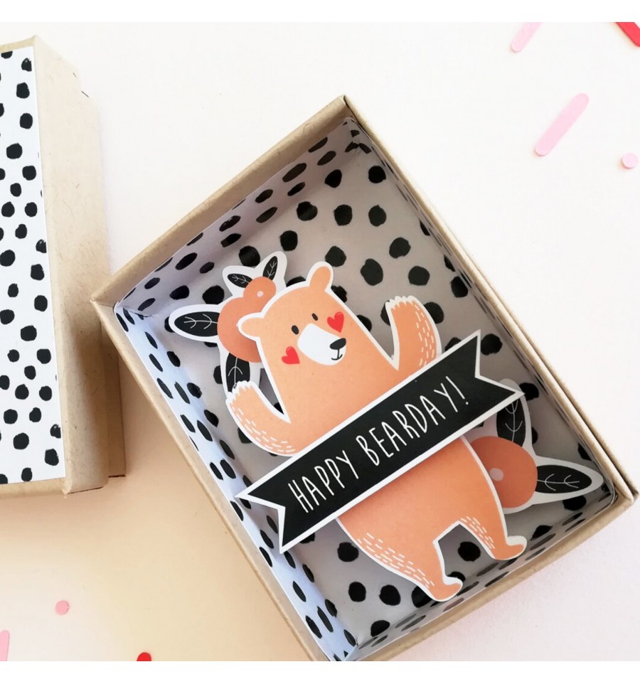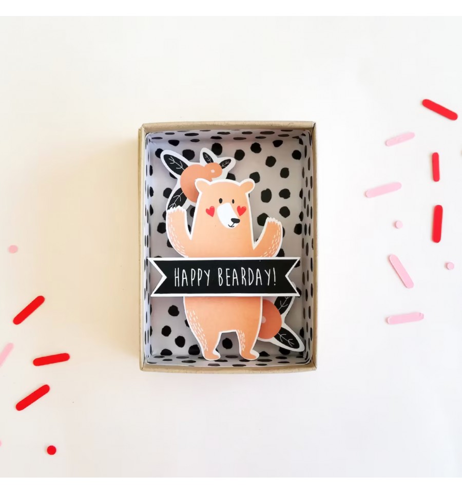 Lorsque vous ouvrirez cette petite boite, vous découvrirez un ours en papier portant le message "Happy Bearday" = Joyeux anniversaire > jeu de mot sur mot "Bear" qui signifie "ours" en anglais.