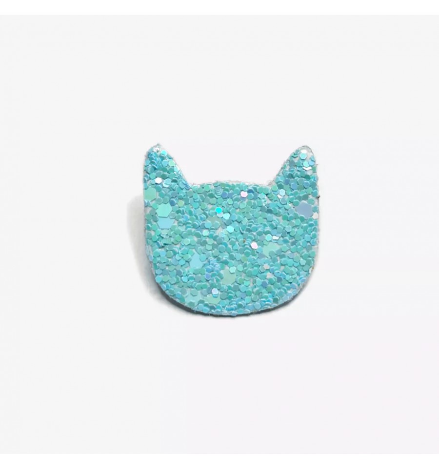 Ce pin's en forme de chat turquoise est en feutrine et en paillettes.