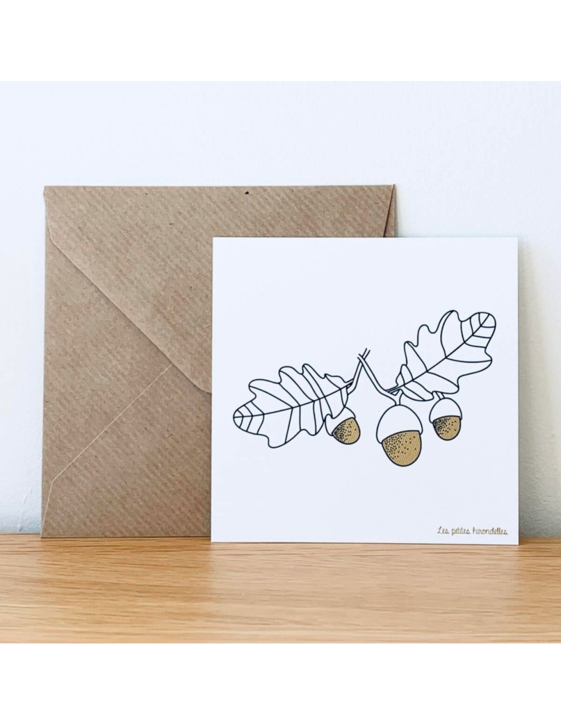 Cette jolie carte illustrée de feuilles de chênes et de ses glands dorés sera le parfait accompagnement pour un cadeau, pour partager une pensée ou simplement écrire un mot mignon.