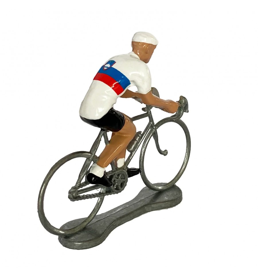 Cette figurine en métal représente un cycliste portant le maillot de la Slovénie