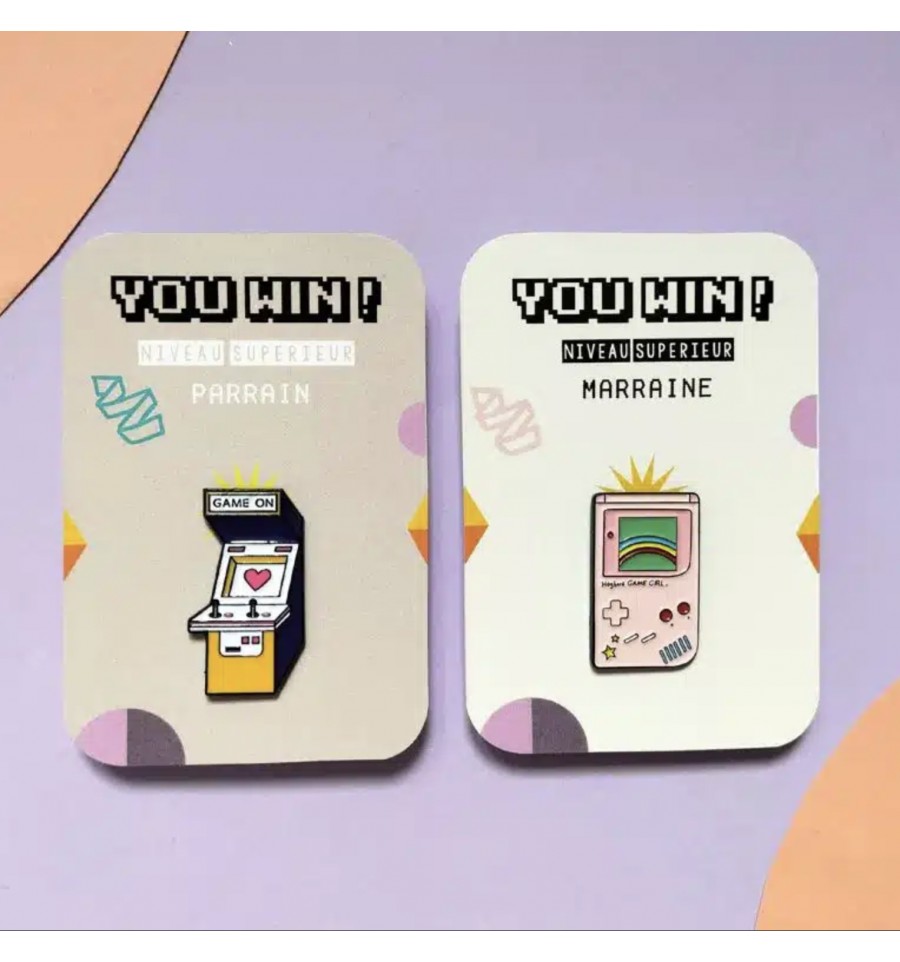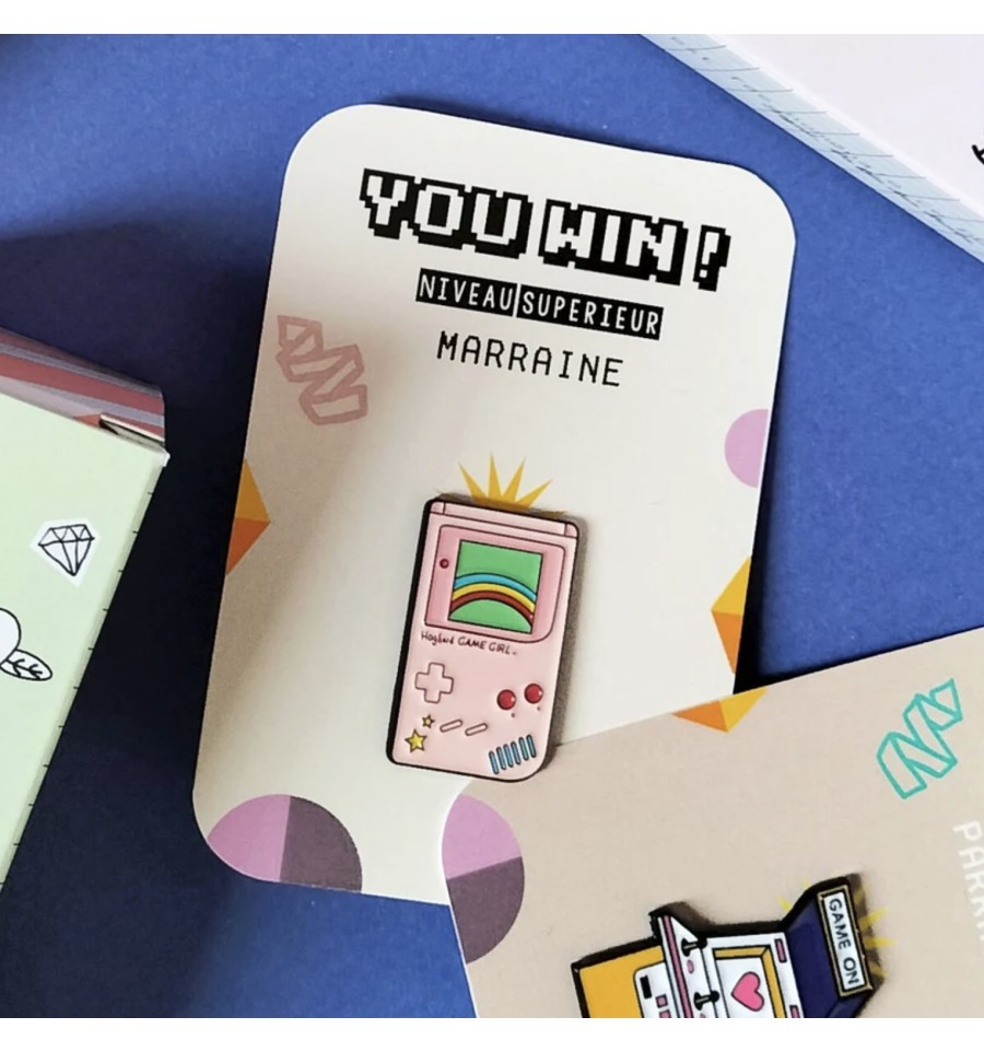 Ce pin’s retro Pamela Loops et son carton "You Win ! Niveau supérieur Marraine", destiné à la future marraine vont faire sensation.
