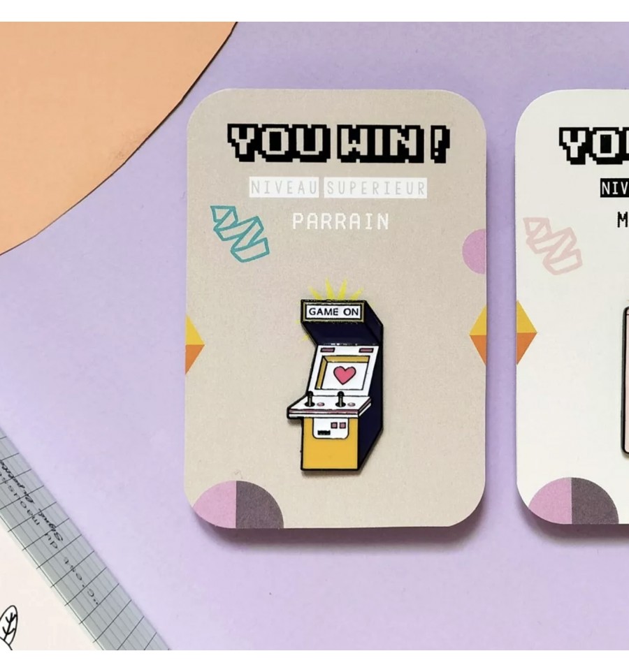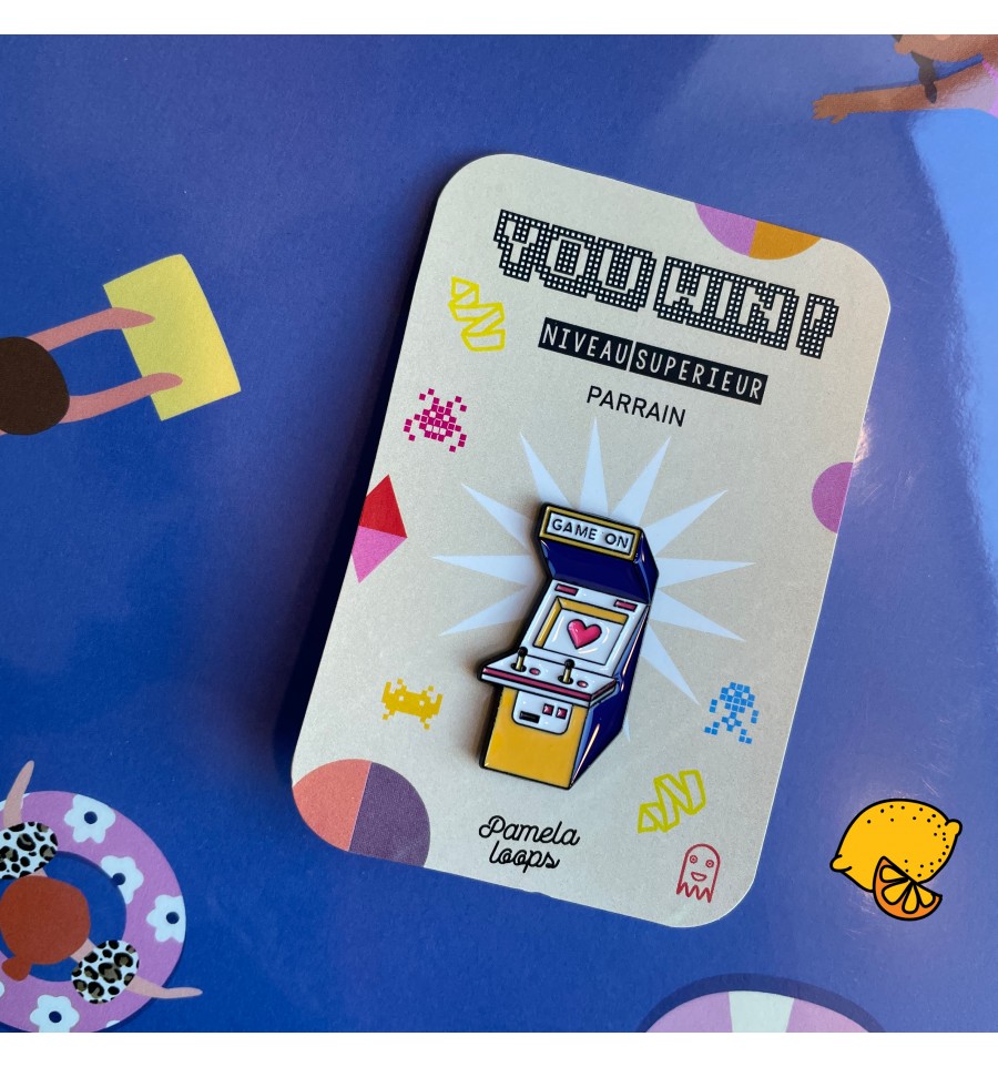 Ce pin’s retro Pamela Loops et son carton "You Win ! Niveau supérieur Parrain", destiné au futur parrain vont faire sensation.